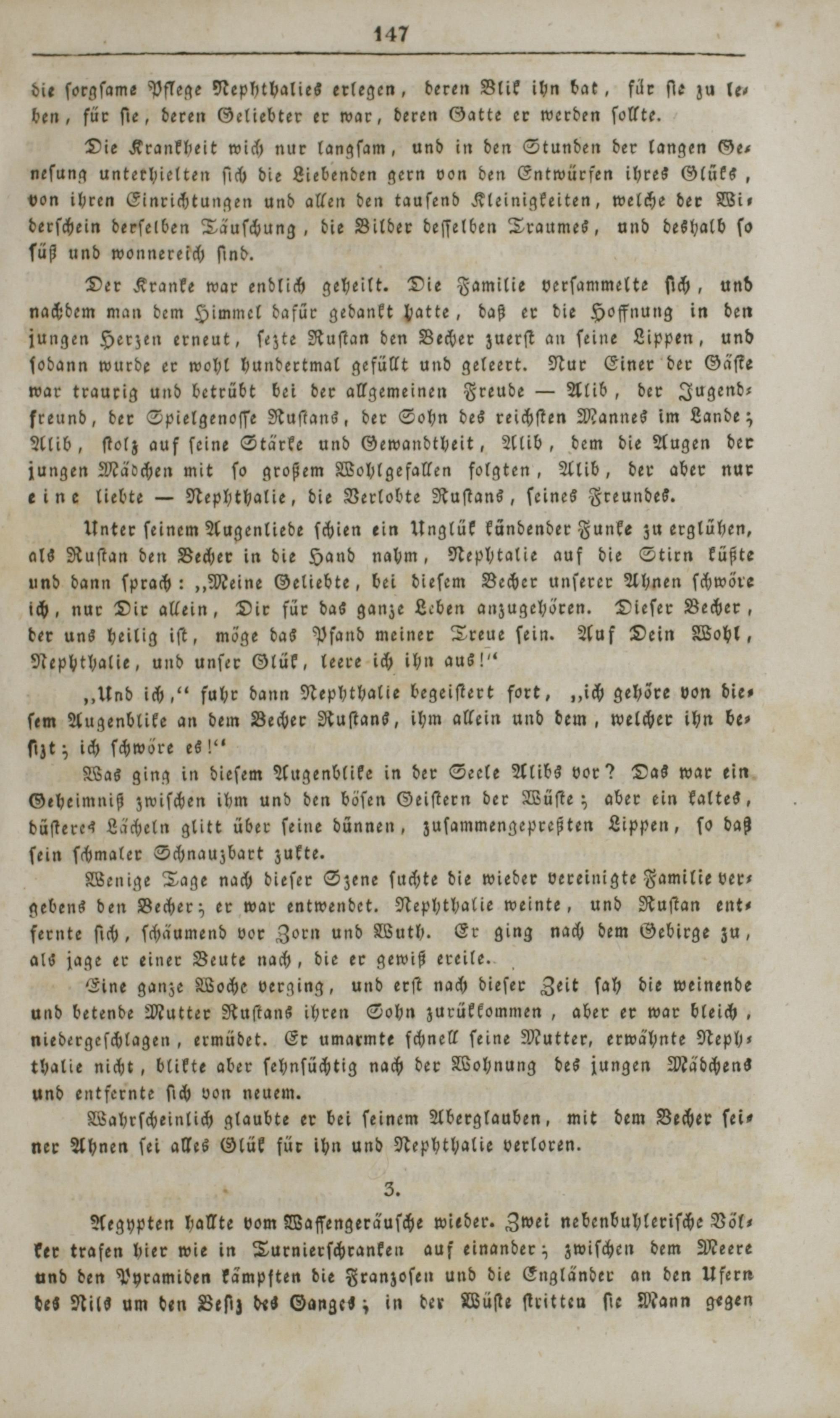 Der Kranke war endlich geheilt. Die Familie verſammelte ſich, und nachdem man dem Himmel dafür gedankt hatte, daß er die Hoffnung in den jungen Herzen erneut, ſezte Ruſtan den Becher zuerſt an ſeine Lippen, und ſodann wurde er wohl hundertmal gefüllt und geleert. Nur Einer der Gäſte war traurig und betrübt bei der allgemeinen Freude— Alib, der Jugend— freund, der Spielgenoſſe Ruſtans, der Sohn des reichſten Mannes im Lande; Alib, ſtolz auf ſeine Stärke und Gewandtheit, Alib, dem die Augen der jungen Mädchen mit ſo großem Wohlgefallen folgten, Alib, der aber nur eine liebte— Nephthalie, die Verlobte Ruſtans, ſeines Freundes.