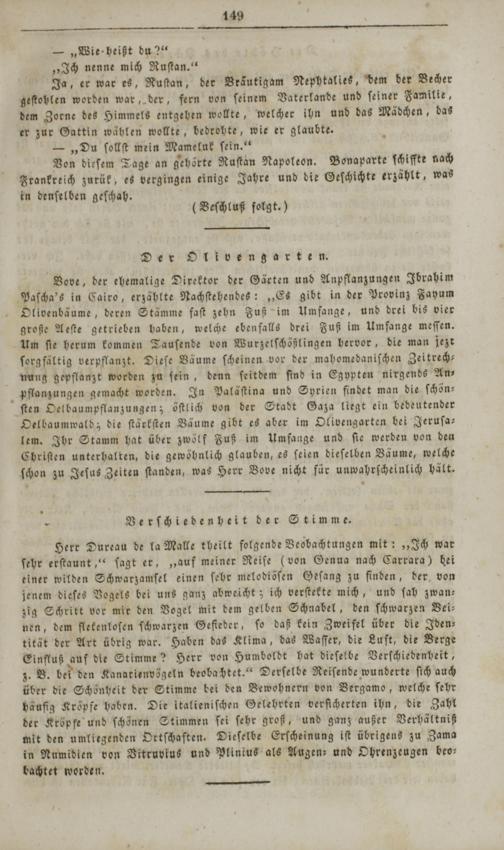 Bove, der ehemalige Direktor der Gärten und Anpflanzungen Ibrahim Paſcha's in Cairo, erzählte Nachſtehendes:„Es gibt in der Provinz Fayum Olivenbäume, deren Stämme faſt zehn Fuß im Umfange, und drei bis vier große Aeſte getrieben haben, welche ebenfalls drei Fuß im Umfange meſſen. um ſie herum kommen Tauſende von Wurzelſchößlingen hervor, die man jezt ſorgfältig verpflanzt. Dieſe Bäume ſcheinen vor der mahomedaniſchen Zeitrech⸗ nung gepflanzt worden zu ſein, denn ſeitdem ſind in Egypten nirgends An⸗ pflanzungen gemacht worden. In Paläſtina und Syrien findet man die ſchön— ſten Oelbaumpflanzungen; öſtlich von der Stadt Gaza liegt ein bedeutender Oelbaumwald; die ſtärkſten Bäume gibt es aber im Olivengarten bei Jeruſa— lem. Ihr Stamm hat über zwölf Fuß im Umfange und ſie werden von den Chriſten unterhalten, die gewöhnlich glauben, es ſeien dieſelben Bäume, welche ſchon zu Jeſus Zeiten ſtanden, was Herr Vove nicht für unwahrſcheinlich hält.
