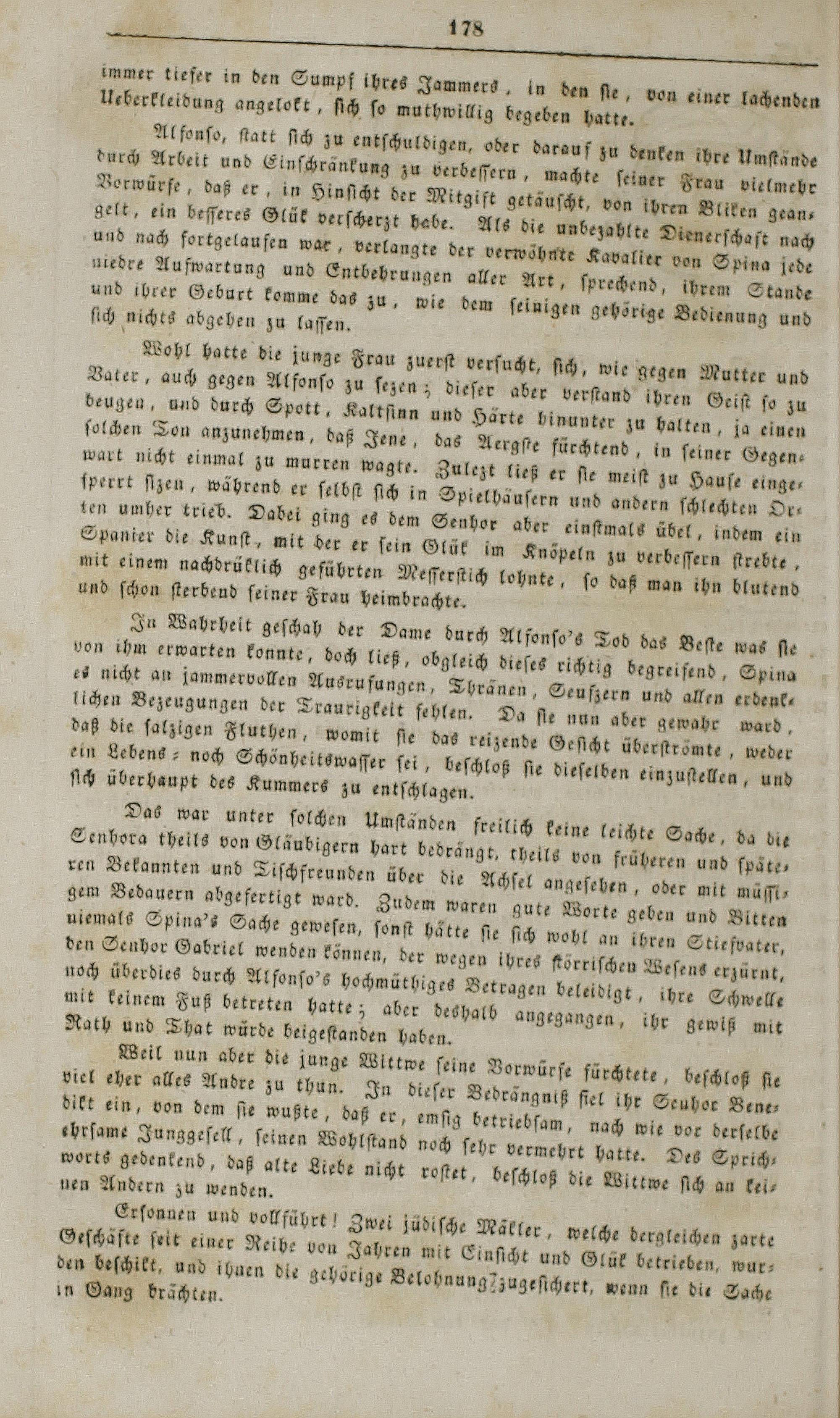In Wahrheit geſchah der Dame durch Al fonſo's Tod das Beſte was ſſe von ihm erwarten konnte, doch ließ, obgleich dieſes richtig begreiſend, Spina es nicht an jammervollen Aus rufungen, Thränen, Seufzern und allen erbenk⸗ lichen Bezeugungen der Traurigkeit fehlen. Da ſte nun aber gewahr ward, daß die ſalzigen Fluthen, womtt ſie das reizende Geſicht überſtrͤmte, weder ein Lebens ⸗ noch Schönheitswaſſer ſel, beſchloß ſie dieſelben einzuſtellen, und ſich über haupt des Kummers zu entſchlagen.