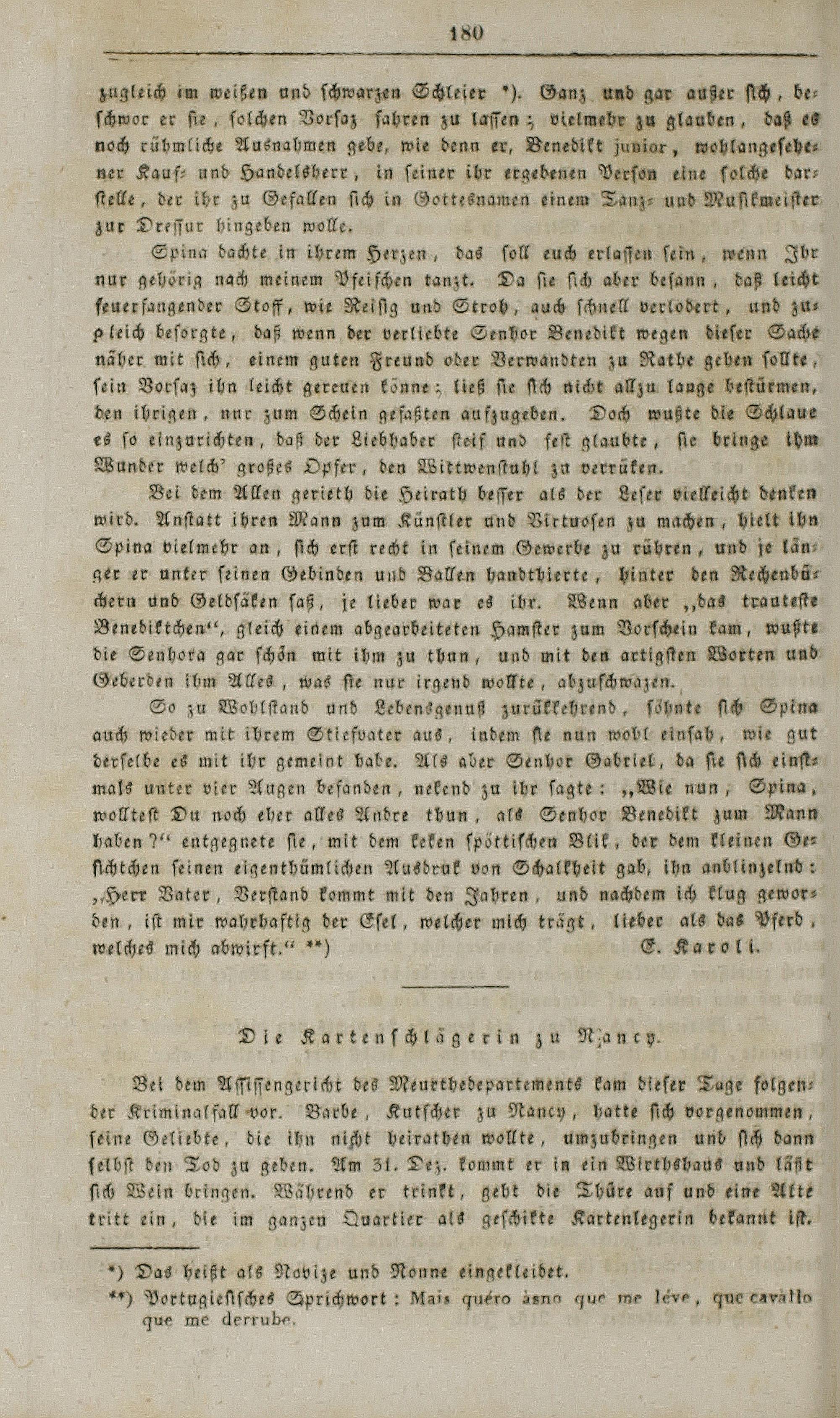 Bel dem Aſſiſſengerlcht des Meurthedepartements kam bieſer Toge folgen⸗ der Kriminalfall vor. Barbe, Kutſcher zu Nancy, hatte ſich vorgenommen ſeine Geliebte, die ihn nicht beirathen wollte, umzubringen und ſich dann ſelbſt den Tod zu geben. Am 31. Dez. kommt er in ein Wirthsbaus und läßt ſich Wein bringen. Während er trinkt, geht die Thüre auf und eine Alte tritt ein, die im ganzen Quartier als geſchikte Kartenlegerin bekannt iſt.