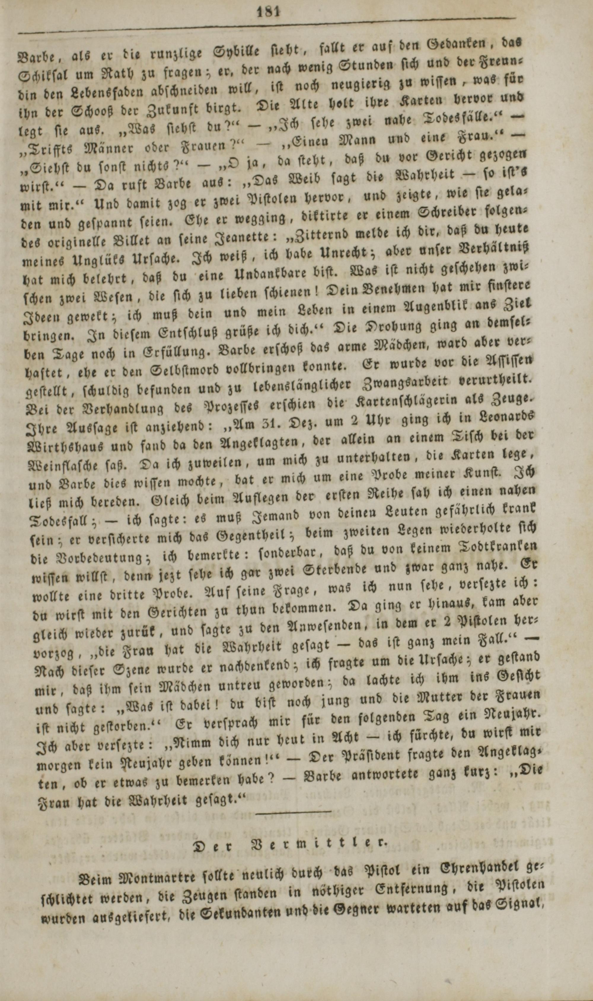 Barbe, als er die runzlige Sybille ſieht, fallt er auf den Gedanken, das Schitſal um Rath zu fragen; er, der nach wenig Stunden ſich und der Freun⸗ din den Lebensfaden abſchneiden will, iſt noch neugierig zn wiſſen, was für iyn der Schooß der Zukunft birgt. Die Alte holt ibre Karten bervor und legt ſie aus.„Was ſiehſt du?“—„Ich ſehe zwei nahe Todes fälle.“— „Triffts Männer oder Frauen?“—„Einen Mann und eine Frau.“— „Oiehſt du ſonſt nichts?“—„O ja, da ſteht, daß du vor Gericht gezogen wirſt.“— Da ruft Barbe aus:„Das Weib ſagt die Wahrheit— ſo iſt's mit mir.“ Und damit zog er zwei Piſtolen hervor, und zeigte, wie ſie gela⸗ den und geſpannt ſeien. Ehe er wegging, diktirte er einem Schreiber folgen⸗ des originelle Billet an ſeine Jeanette:„Zitternd melde ich dir, daß du heute meines Unglüks Urſache. Ich weiß, ich babe Unrecht; aber unſer Verhältniß hat mich belehrt, daß du eine Undankbare biſt. Was iſt nicht geſchehen zwi⸗ ſchen zwei Weſen, die ſich zu lieben ſchienen! Dein Benehmen hat mir finſtere Ideen gewekt; ich muß dein und mein Leben in einem Augenblik ans Ziel bringen. In dieſem Entſchluß grüße ich dich.“ Die Drohung ging an demſel⸗ ben Tage noch in Erfüllung. Barbe erſchoß das arme Mädchen, ward aber ver⸗ haftet, ehe er den Selbſtmord vollbringen konnte. Er wurde vor die Aſſiſſen geſtellt, ſchuldig befunden und zu lebenslänglicher Zwangsarbeit verurtheilt. Bei der Verhandlung des Prozeſſes erſchien die Kartenſchlägerin als Zeuge.