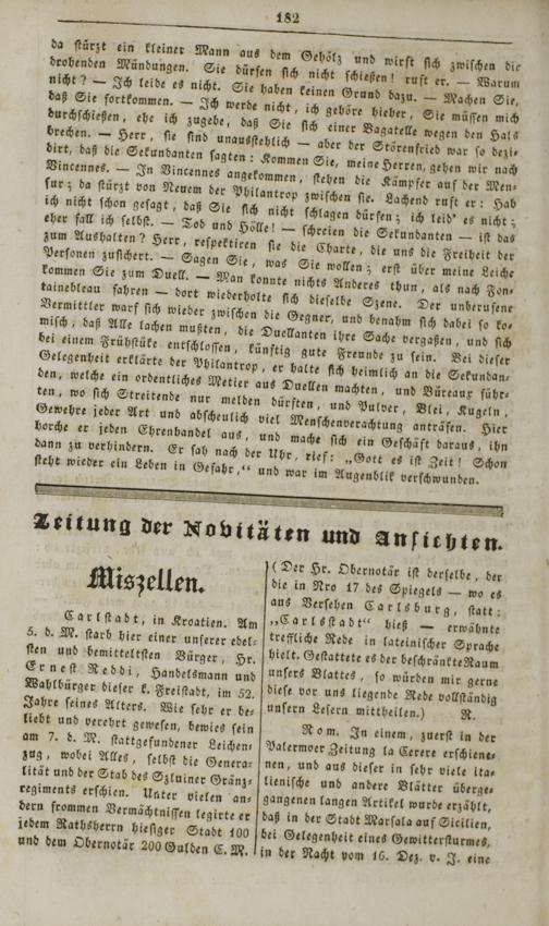 Carlſtabt, in Kroatien. Am 5. d. M. ſtarb bier einer unferer edel⸗ ſten und bemitteltſten Bürger, Hr. Er neſt Nebdi Handelsmann und Wahlbürger bieſer k. Freiſtabt, im 52. Jahre ſeines Alters. Wie ſehr er be⸗ liebt und verehrt geweſen, bewies ſein em 7. d. M. ſtattgefundener Lelchen⸗ zug, wobei Alles, ſelbſt die OGenera⸗ lität und ber Stab des Szluiner Oränz⸗
