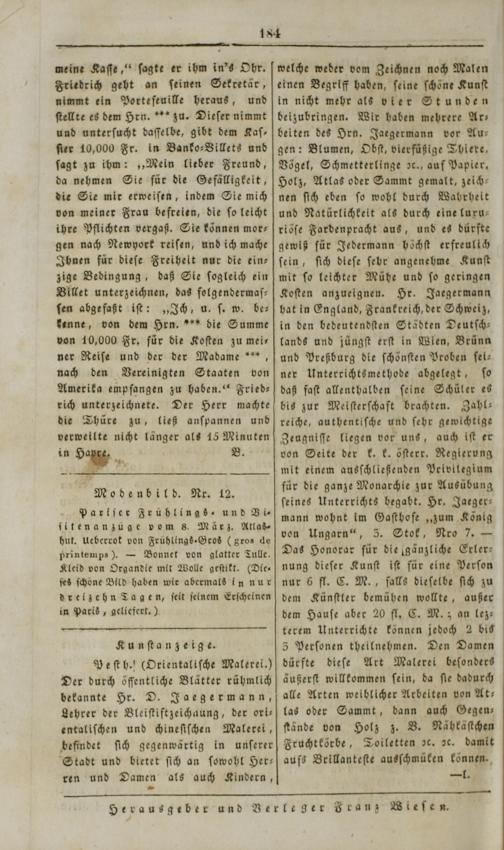 bis zur Melſterſchaft brachten. Zaßl⸗ reiche, authentſſche und ſehr gewichtige Zeugniſſe liegen vor uns, auch iſt er von Seite der k. k. öſterr. Reglerung mit einem ausſchließenden Privilegium für die ganze Monarchie zur Ausübung ſeines Unterrichts begabt. Hr. Jacger⸗ mann wohnt im Gaſthoſe„zum König