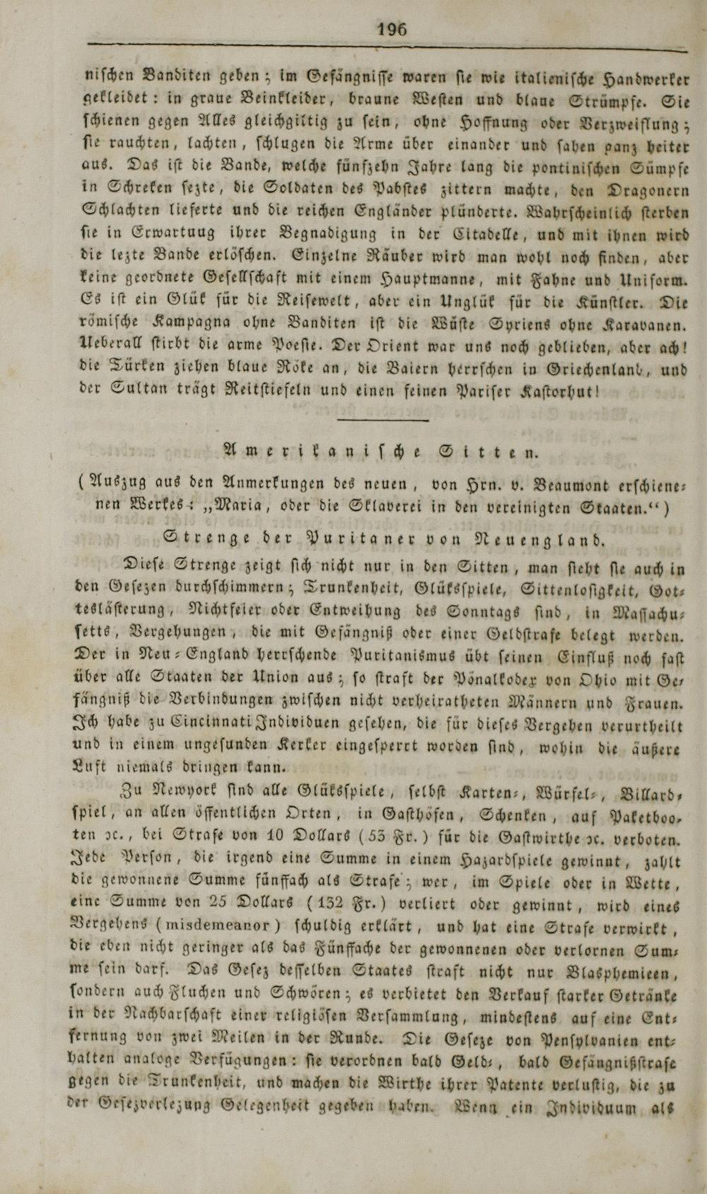 Dieſe Strenge zeigt ſich nicht nur in den Sitten, man ſieht ſie 40547 den Geſezen durchſchimmern; Trunkenheit, Glüksſpiele, Sittenloſigkelt, Got⸗ tesläſterung, Nichtfeler oder Entweihung des Sonntags ſind, in Maſſachu⸗ ſetts, Vergehungen, die mit Gefängniß oder einer Geldſtraſe belegt werden. Der in Neu⸗England herrſchende Purktanismus übt ſeinen Einfluß noch ſaſt über alle Staaten der Unlon aus; ſo ſtraft der Pönalkodex von Obio mit Ge⸗ fängniß die Verbindungen zwiſchen nicht verhelratheten Männern und Frauen. Ich habe zu Einelnnati Indivlduen geſehen, die für dieſes Vergeben verurtheilt und in einem ungeſunden Kerker eingeſperrt worden ſind, wohin die äußere Luft niemals dringen kann⸗ 5. 11