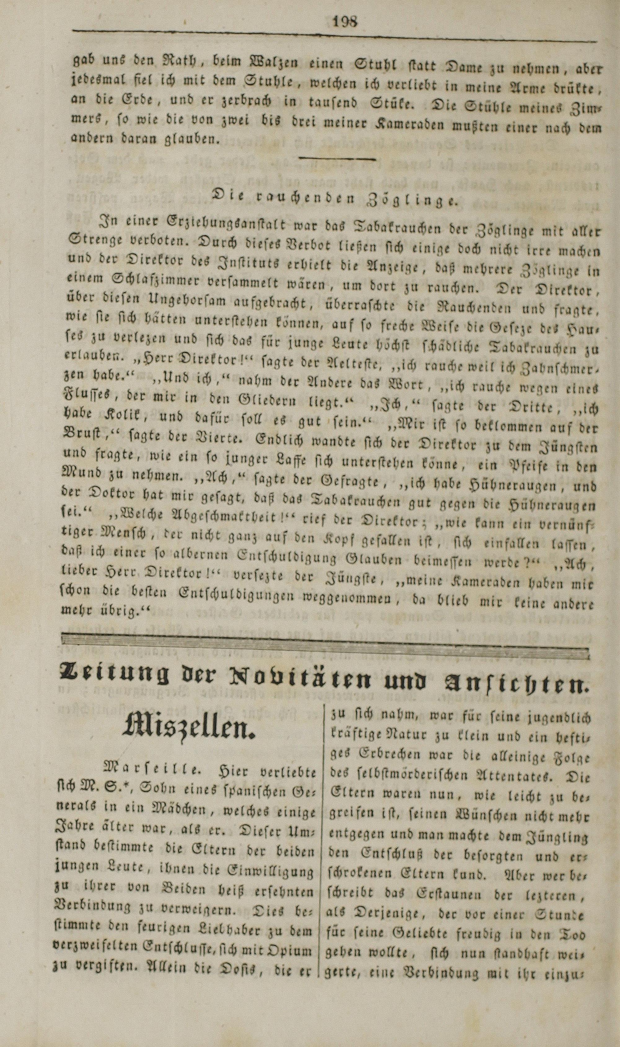 überraſchte die Nauchenden und fragte wie ſte ſich hätten unterſtehen können, auf ſo freche zu verlezen und ſich das für junge Leute höchſt