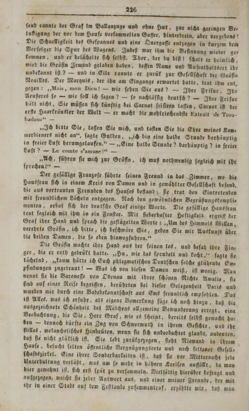 Die Gräfin machte ihre Hand aus der ſeinen los, und beſah ihre Fin⸗ ger, die er roth gedrükt hatte.„Hu, wie das ſprudelt und kocht,“ ſagte ſie lächelnd,„kaum hätte ich Euch phlegmatiſchen Deutſchen ſolche glühende Em pfindungen zugetraut!— Was ich von dieſen Damen weiß, iſt wenig. Man nennt ſie die Baroneſſe von Odenau mit ihrer ſchönen Nichte Amalie, ſie ſind auf einer Reiſe begriffen, berührten bei dieſer Gelegenheit Paris und wurden mir durch eine Badebekanntſchaft aus Ems freundlich empfohlen. Das iſt Alles, was ich erfuhr, als eigene Bemerkung füge ich noch hinzu, daß die ausgezeichnete Schönheit des Mädchens allgemeine Bewunderung erregt, eine Beobachtung, die Sie, Herr Graf, wie es ſcheint, bereits ſelbſt gemacht ha⸗ ben— dennoch dürfte ein Zug von Schwermuth in ihrem Geſichte, und ihr ſtilles, melancholiſches Hinbrüten, wenn ſie ſich unbeobachtet glaubt, andeuten, daß ſie nicht glüklich iſt. Sie lebt zurükgezogen, ſieht Niemand in ihrem Hauſe, beſucht ſelten öffentliche Vergnügungsorte und noch ſeltener Geſell⸗ ſchaftszirkel. Eine ihrer Sonderbarkeiten iſt, daß ſie vor Mitternacht jede Unterhaltung verläßt, was um ſo mehr in höhern Kreiſen auffällt, da man hier gewohnt iſt, ſich erſt ſpaät zu verſammeln. Vielfältig bierüber befragt und aufgezogen, weicht ſie jeder Antwort aus, und einer meiner Freunde, der mit ihr in einer Stadt auf dem Feſtlande zuſammentraf, erzählte mir, daß man