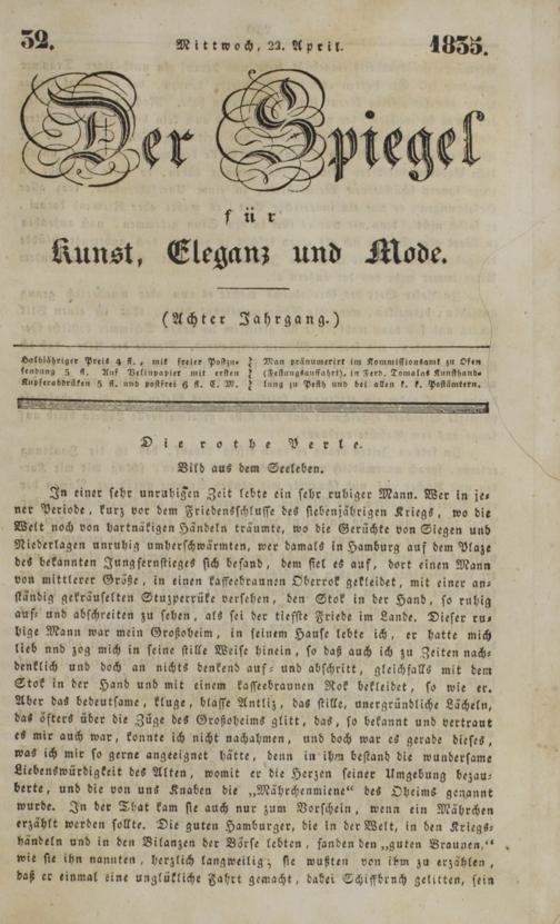 Halbjähriger Preis 4 fl., mit freier Poſtzu⸗ ſendung 5 fl. Auf Velinpapier mit erſten Kupferabdrilken 5 fl. und poſtfrei 6 fl. C. M.