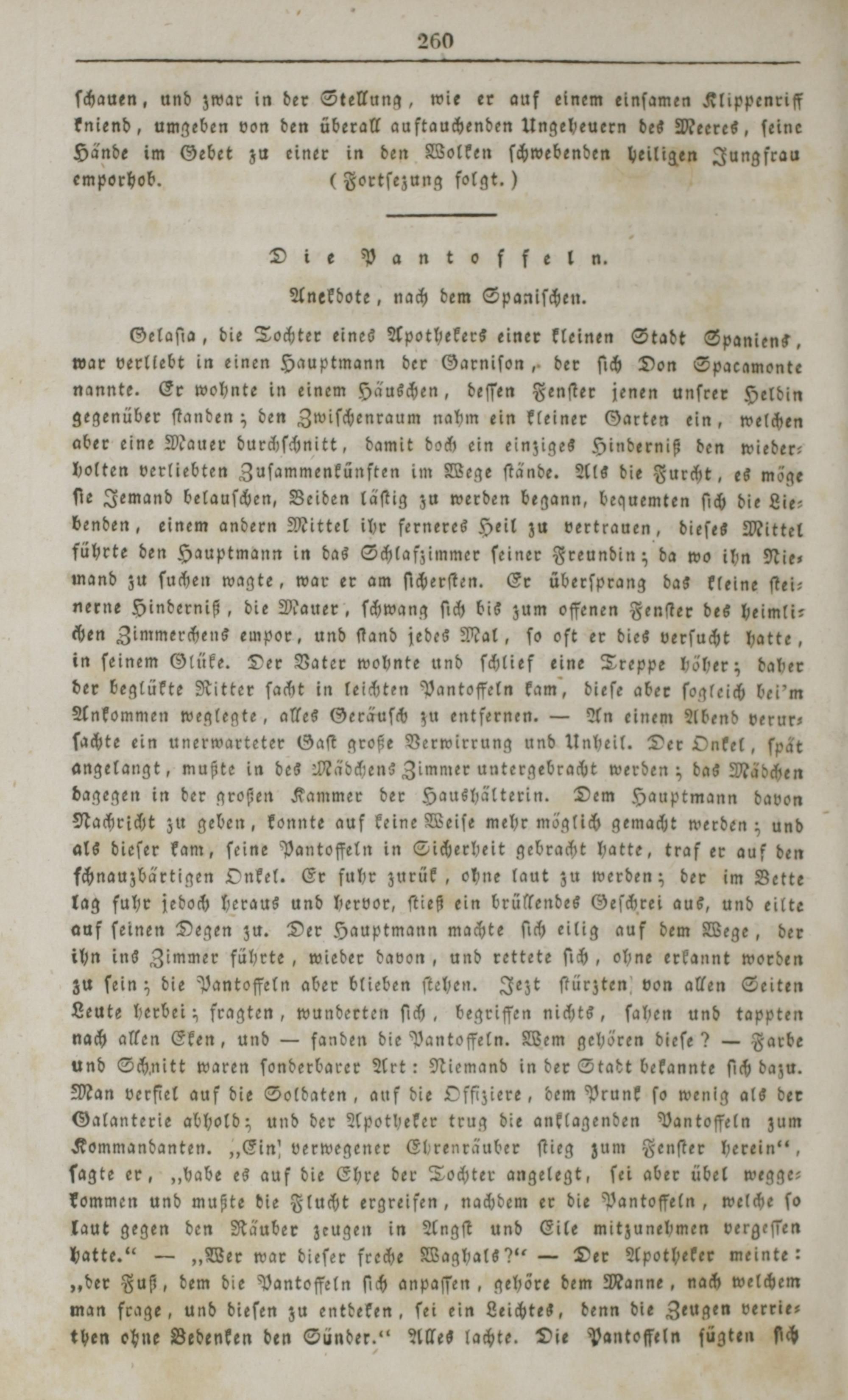 Gelaſta, die Tochter eines Apothekers einer kleinen Stadt Spaniens, war verllebt in einen Hauptmann der Garniſon, der ſich Don Spacamonte nannte. Er wohnte in einem Häuschen, deſſen Fenſter jenen unſrer Heldin gegenüber ſtanden; den Zwiſchenraum nahm ein kleiner Garten ein, welchen aber eine Mauer durchſchnitt, damit doch ein einziges Hinderniß den wieder— holten verliebten Zuſammenkünften im Wege ſtände. Als die Furcht, es möge ſie Jemand belauſchen, Beiden läſtig zu werden begann, bequemten ſich die Lie— benden, einem andern Mittel ihr ferneres Heil zu vertrauen, dieſes Mittel führte den Hauptmann in das Schlafzimmer ſeiner Freundin; da wo ihn Nie⸗ mand zu ſuchen wagte, war er am ſicherſten. Er überſprang das kleine ſtei⸗ nerne Hinderniß, die Mauer, ſchwang ſich bis zum offenen Fenſter des heimli— chen Zimmerchens empor, und ſtand jedes Mal, ſo oft er dies verſucht hatte, in ſeinem Glüke. Der Vater wohnte und ſchlief eine Treppe höher; daher der beglükte Ritter ſacht in leichten Pantoffeln kam, dieſe aber ſogleich bei'm Ankommen weglegte, alles Geräuſch zu entfernen.— An einem Abend verur— ſachte ein unerwarteter Gaſt große Verwirrung und Unheil. Der Onkel, ſpaͤt angelangt, mußte in des Mädchens Zimmer untergebracht werden; das Mädchen dagegen in der großen Kammer der Haushälterin. Dem Hauptmann davon Nachricht zu geben, konnte auf keine Weiſe mehr möglich gemacht werden; und als dieſer kam, ſeine Pantoffeln in Sicherheit gebracht hatte, traf er auf den fchnauzbärtigen Onkel. Er fuhr zurük, ohne laut zu werden; der im Bette lag fuhr jedoch heraus und hervor, ſtieß ein brüllendes Geſchrei aus, und eilte auf ſeinen Degen zu. Der Hauptmann machte ſich eilig auf dem Wege, der ihn ins Zimmer führte, wieder davon, und rettete ſich, ohne erkannt worden zu ſein; die Pantoffeln aber blieben ſtehen. Jezt ſtürzten von allen Seiten Leute herbei; fragten, wunderten ſich, begriffen nichts, ſahen und tappten nach allen Eken, und— fanden die Pantoffeln. Wem gehören dieſe?— Farbe und Schnitt waren ſonderbarer Art: Niemand in der Stadt bekannte ſich dazu. Man verfiel auf die Soldaten, auf die Offiziere, dem Prunk ſo wenig als der Galanterie abhold; und der Apotheker trug die anklagenden Pantoffeln zum Kommandanten.„Ein! verwegener Ehrenräuber ſtieg zum Fenſter herein“, ſagte er,„babe es auf die Ehre der Tochter angelegt, ſei aber übel wegge— kommen und mußte die Flucht ergreifen, nachdem er die Pantoffeln, welche ſo laut gegen den Räuber zeugen in Angſt und Eile mitzunehmen vergeſſen batte.“—„Wer war dieſer freche Waghals?““— Der Apotheker meinte: „der Fuß, dem die Pantoffeln ſich anpaſſen, gehöre dem Manne, nach welchem man frage, und dieſen zu entdeken, ſei ein Leichtes, denn die Zeugen verrie⸗ then ohne Bedenken den Sünder.“ Alles lachte. Die Pantoffeln W