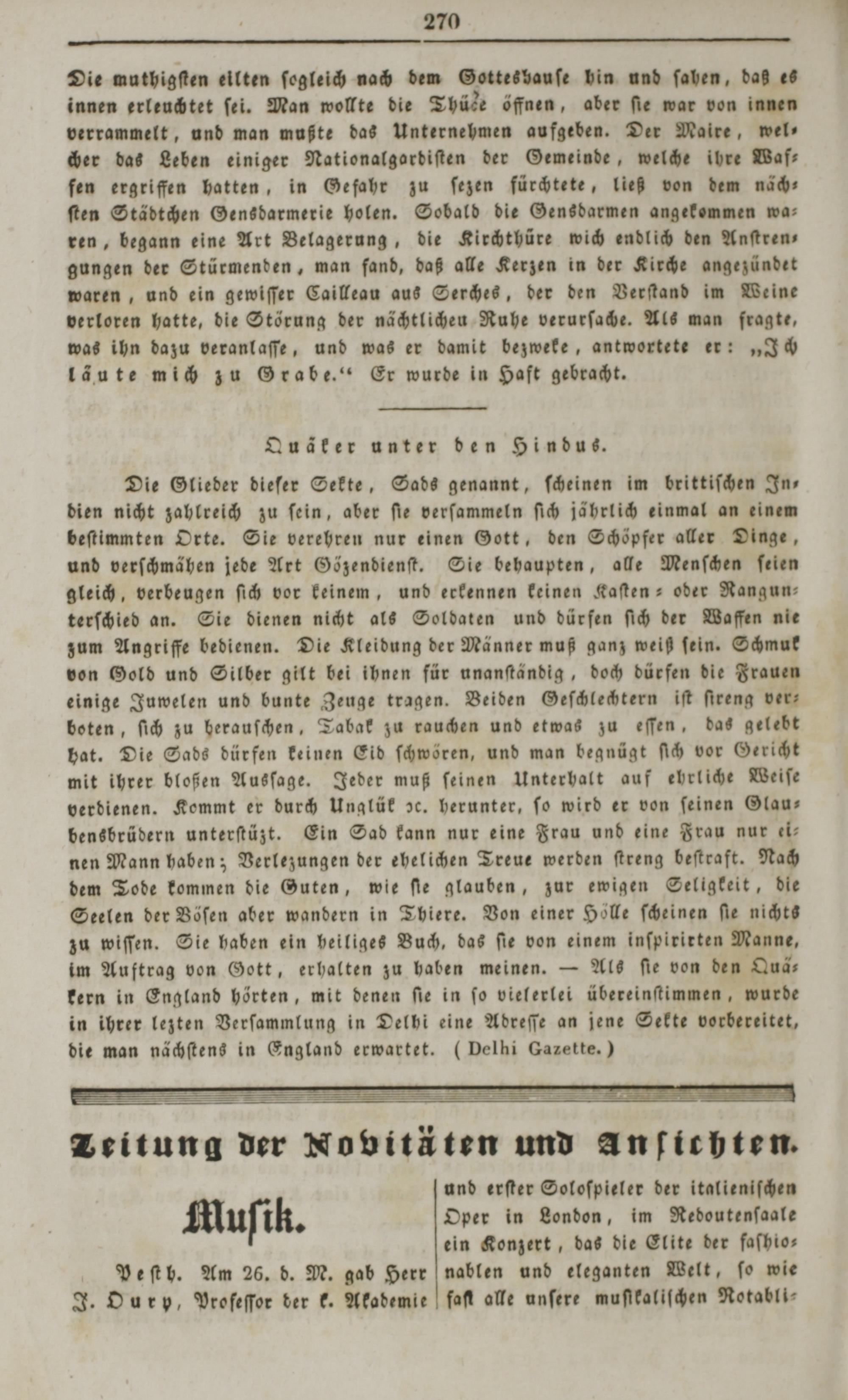 Die Glieder dieſer Sekte, Sads genannt, ſcheinen im brittiſchen In⸗ dien nicht zahlreich zu ſein, aber ſie verſammeln ſich jährlich einmal an einem beſtimmten Orte. Sie verehren nur einen Gott, den Schöpfer aller Dinge, und verſchmähen jede Art Gözendienſt. Sie behaupten, alle Menſchen ſeien gleich, verbeugen ſich vor keinem, und erkennen keinen Kaſten- oder Rangun— terſchied an. Sie dienen nicht als Soldaten und dürfen ſich der Waffen nie zum Angriffe bedienen. Die Kleidung der Männer muß ganz weiß ſein. Schmuk von Gold und Silber gilt bei ihnen für unanſtändig, doch dürfen die Frauen einige Juwelen und bunte Zeuge tragen. Beiden Geſchlechtern iſt ſireng ver⸗ boten, ſich zu berauſchen, Tabak zu rauchen und etwas zu eſſen, das gelebt hat. Die Sads dürfen keinen Eid ſchwören, und man begnügt ſich vor Gericht mit ihrer bloßen Ausſage. Jeder muß ſeinen Unterhalt auf ehrliche Weiſe verdienen. Kommt er durch Unglük dc. herunter, ſo wird er von ſeinen Glau⸗ bensbrüdern unterſtüßt. Ein Sad kann nur eine Frau und eine Frau nur ei⸗ nen Mann haben; Verlezungen der ehelichen Treue werden ſtreng beſtraft. Nach dem Tode kommen die Guten, wie ſie glauben, zur ewigen Seligkeit, die Seelen der Vöſen aber wandern in Thiere. Von einer Hölle ſcheinen ſie nichts zu wiſſen. Sie haben ein heiliges Vuch, das ſie von einem inſpirirten Manne, im Auftrag von Gott, erhalten zu haben meinen.— Als ſie von den Quä⸗ kern in England hörten, mit denen ſie in ſo vielerlei übereinſtimmen, wurde in ihrer lezten Verſammlung in Delhi eine Adreſſe an jene Sekte vorbereitet, die man nächſtens in England erwartet.(Delhi Gazette.)