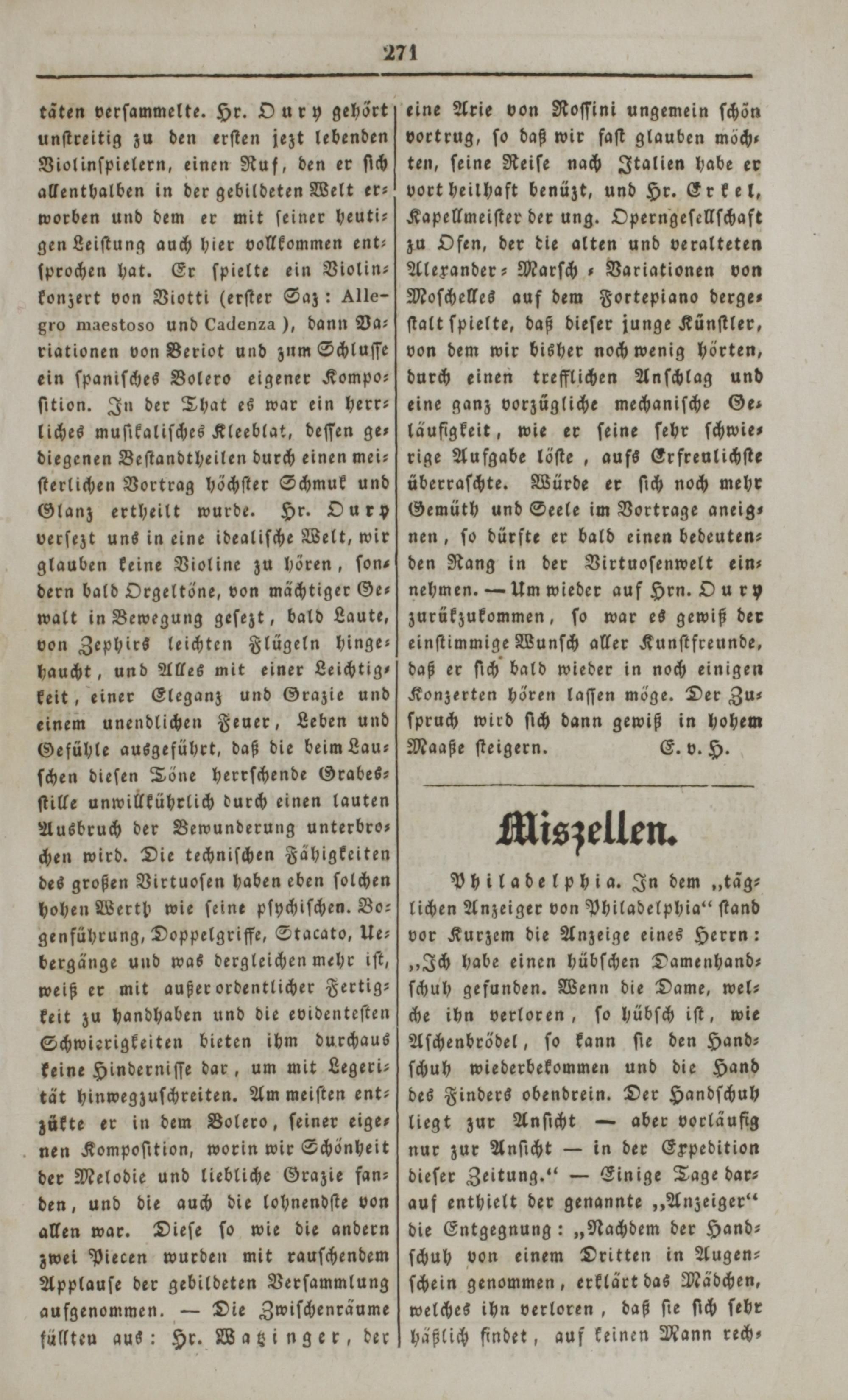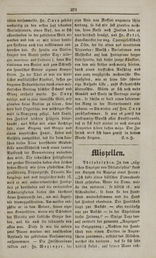 täten verſammelte. Hr. Oury gehört unſtreitig zu den erſten jezt lebenden Violinſpielern, einen Ruf, den er ſich allenthalben in der gebildeten Welt er⸗ worben und dem er mit ſeiner heuti⸗ gen Leiſtung auch hier vollkommen ent⸗ ſprochen hat. Er ſpielte ein Violin⸗ konzert von Viotti(erſter Saz: Alle- gro maestoso und Cadenza), dann Va— riationen von Veriot und zum Schluſſe ein ſpaniſches Bolero eigener Kompo— ſition. In der That es war ein herr— liches muſikaliſches Kleeblat, deſſen ge⸗ diegenen Beſtandtheilen durch einen mei— ſterlichen Vortrag höchſter Schmuk und Glanz ertheilt wurde. Hr. Oury verſezt uns in eine idealiſche Welt, wir glauben keine Violine zu hören, ſon— dern bald Orgeltöne, von mächtiger Ge— walt in Bewegung geſezt, bald Laute, von Zephirs leichten Flügeln hinge— haucht, und Alles mit einer Leichtig⸗ keit, einer Eleganz und Grazie und einem unendlichen Feuer, Leben und Gefühle ausgeführt, daß die beim Lau⸗ ſchen dieſen Töne herrſchende Grabes— ſtille unwillkührlich durch einen lauten Ausbruch der Bewunderung unterbro— chen wird. Die techniſchen Fähigkeiten des großen Virtuoſen haben eben ſolchen hohen Werth wie ſeine pſychiſchen. Bo— genführung, Doppelgriffe, Stacato, Ue⸗ bergänge und was dergleichen mehr iſt, weiß er mit außer ordentlicher Fertig— keit zu handhaben und die evidenteſten Schwierigkeiten bieten ihm durchaus keine Hinderniſſe dar, um mit Legeri⸗ tät hinwegzuſchreiten. Am meiſten ent⸗ zükte er in dem Bolero, ſeiner eige⸗ nen Kompoſition, worin wir Schönheit der Melodie und liebliche Grazie fan⸗ den, und die auch die lohnendſte von allen war. Dieſe ſo wie die andern zwei Piecen wurden mit rauſchendem Applauſe der gebildeten Verſammlung aufgenommen.— Die Zwiſchenräume füllten aus: Hr. Watzinger, der