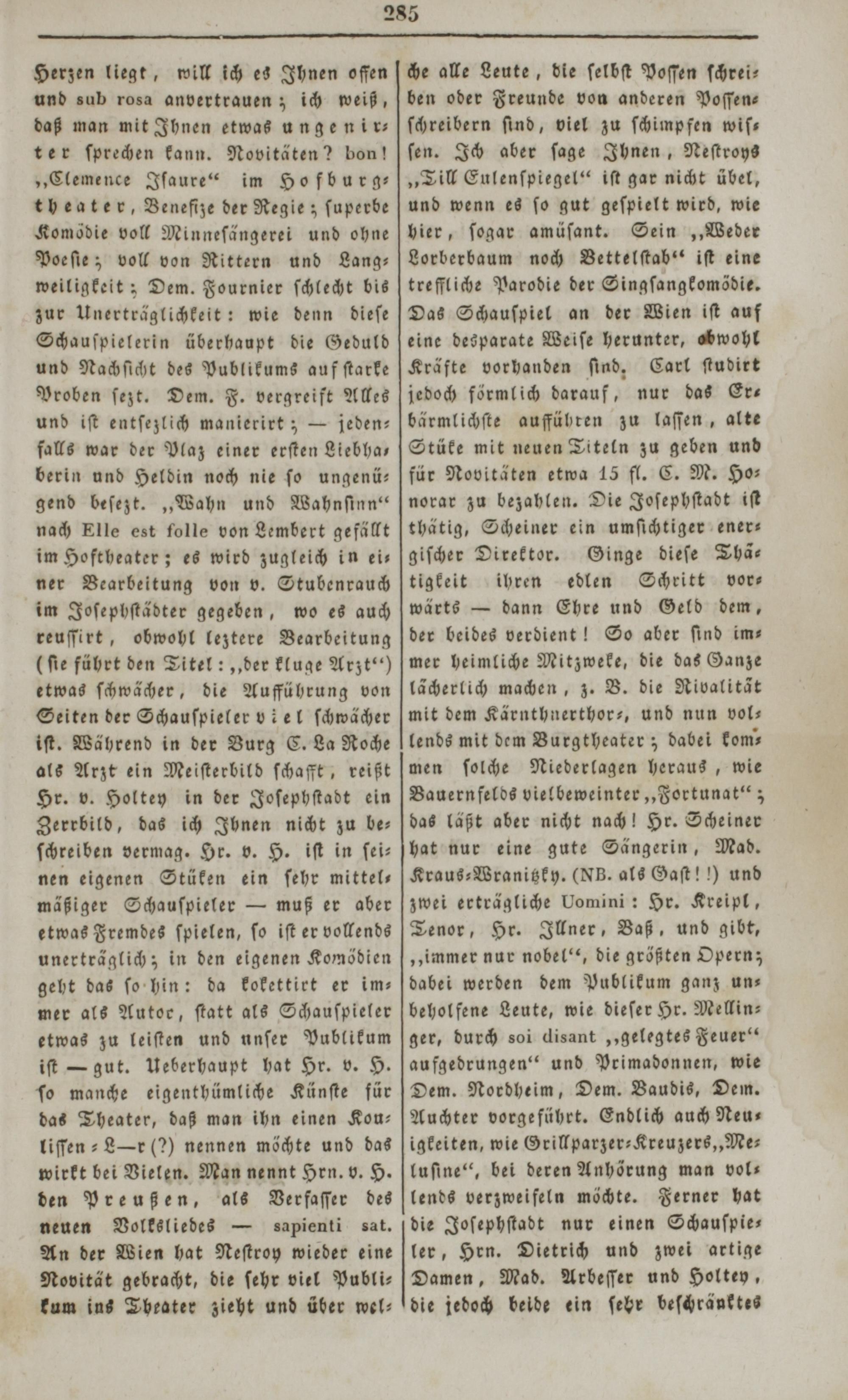 che alle Leute, die ſelbſt Poſſen ſchrei—⸗ ben oder Freunde von anderen Poſſen— ſchreibern ſind, viel zu ſchimpfen wiſ— ſen. Ich aber ſage Ihnen, Neſtroys „Till Eulenſpiegel“ iſt gar nicht übel, und wenn es ſo gut geſpielt wird, wie hier, ſogar amüſant. Sein„Weder Lorberbaum noch Bettelſtab“ iſt eine treffliche Parodie der Singſangkomödie. Das Schauſpiel an der Wien iſt auf eine desparate Weiſe herunter, obwohl Kräfte vorhanden ſind,. Carl ſtudirt jedoch förmlich darauf, nur das Er— bärmlichſte aufführen zu laſſen, alte Stüke mit neuen Titeln zu geben und für Novitäten etwa 15 fl. C. M. Ho⸗ norar zu bezahlen. Die Joſephſtadt iſt thätig, Scheiner ein umſichtiger ener giſcher Direktor. Ginge dieſe Thä— tigkeit ihren edlen Schritt vor— wärts— dann Ehre und Geld dem, der beides verdient! So aber ſind im—⸗ mer heimliche Mitzweke, die das Ganze lächerlich machen, z. B. die Rivalität mit dem Kärnthnerthor-, und nun vol⸗ lends mit dem Burgtheater; dabei kom⸗ men ſolche Niederlagen heraus, wie Bauernfelds vielbeweinter„Fortunat“; das läßt aber nicht nach! Hr. Scheiner hat nur eine gute Sängerin, Mad. Kraus-Wranitzk y.(NB. als Gaſt!!) und zwei erträgliche Lomini: Hr. Kreipl, Tenor, Hr. Illner, Baß, und gibt, „immer nur nobel“, die größten Opern; dabei werden dem Publikum ganz un⸗ beholfene Leute, wie dieſer Hr. Mellin⸗ ger, durch soi disant„gelegtes Feuer“ aufgedrungen“ und Primadonnen, wie Dem. Nordheim, Dem. Vaudis, Dem. Auchter vorgeführt. Endlich auch Neu⸗ igkeiten, wie Grillparzer-Kreuzers,„Me⸗ luſine“, bei deren Anhörung man vol— lends verzweifeln möchte. Ferner hat die Joſephſtadt nur einen Schauſpie— ler, Hrn. Dietrich und zwei artige Damen, Mad. Arbeſſer und Holtey, die jedoch beide ein ſehr beſchränktes
