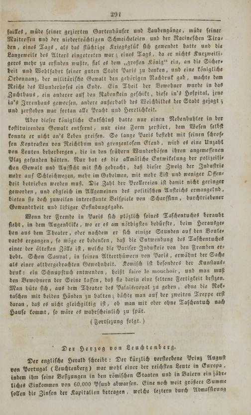 Aber dieſer königliche Entſchluß hatte nur einen Nebenbuhler in der koſtituirenden Gewalt entfernt, nur eine Form zerſtört, dem Weſen ſelbſt konnte er nicht an's Leben greifen. So lange Paris beſteht mit ſeinen ſchrof— fen Kontraſten von Reichthum und grenzenloſem Elend, wird es eine Unzahl von Leuten beherbergen, die in den frühern Wunderhöfen ihren angemeſſenen Plaz gefunden hätten. Nur bat es die allmäliche Entwikelung der polizeili⸗ chen Gewalt und Aufſicht mit ſich gebracht, daß dieſer Zweig der Induſtrie mehr auf Schleichwegen, mehr im Geheimen, mit mehr Liſt und weniger Offen⸗ heit betrieben werden muß. Die Zahl der Prellereien iſt damit nicht geringer geworden, und obgleich im Allgemeinen des politiſchen Anſtrichs ermangelnd, bieten ſie doch zuweilen intereſſante Beiſpiele von Scharfſinn, durchtriebener Gewandtheit und liſtiger Erfindungsgabe.
