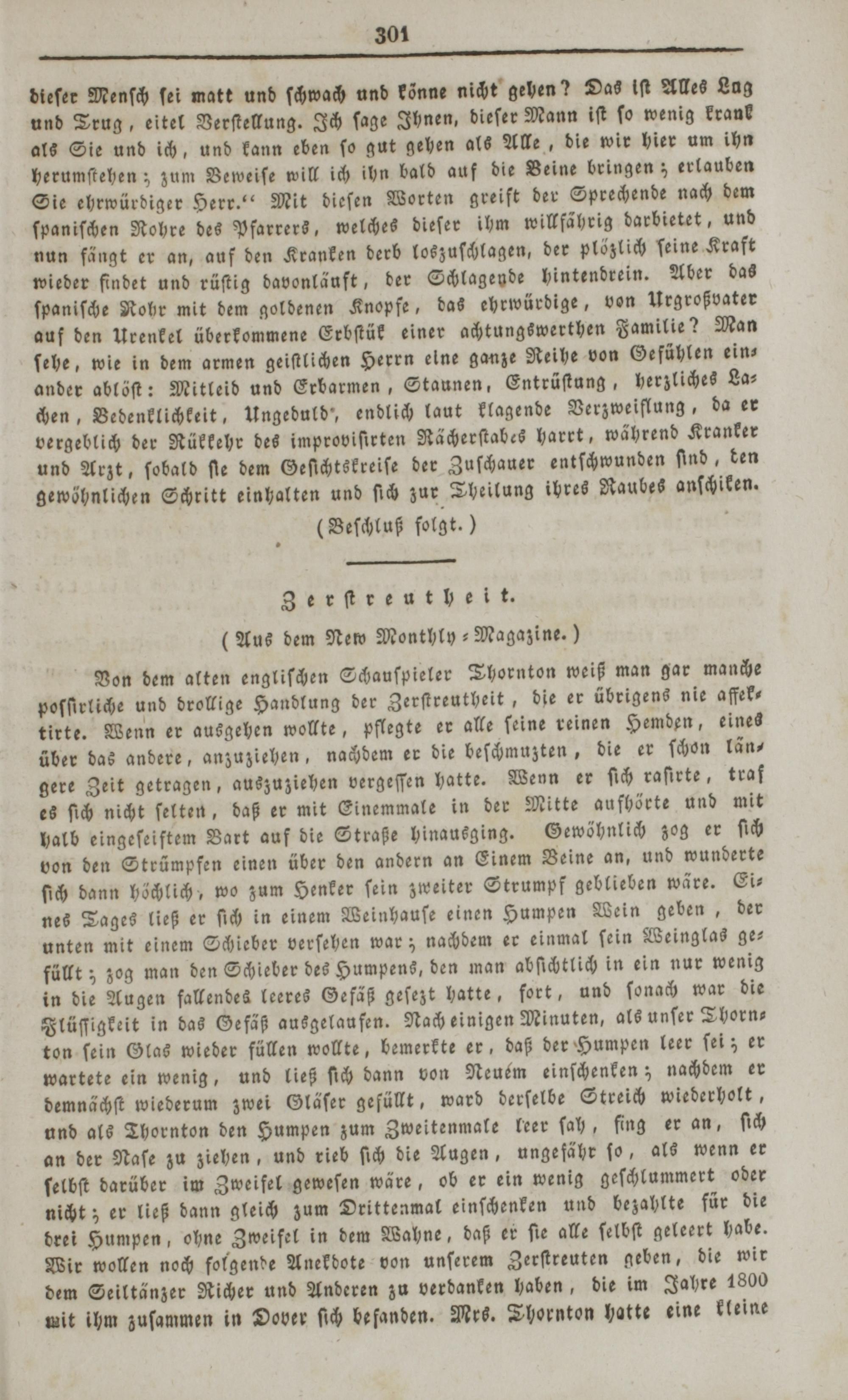 Von dem alten engliſchen Schauſpieler Thornton weiß man gar manche poſſirliche und drollige Handlung der Zerſtreutheit, die er übrigens nie a ffek⸗ tirte. Wenn er ausgehen wollte, pflegte er alle ſeine reinen Hemden, eines über das andere, anzuziehen, nachdem er die beſchmuzten, die er ſchon län- gere Zeit getragen, auszuziehen vergeſſen hatte. Wenn er ſich raſirte, traf es ſich nicht ſelten, daß er mit Einemmale in der Mitte aufhörte und mit halb eingeſeiftem Bart auf die Straße hinausging. Gewöhnlich zog er ſich von den Strümpfen einen über den andern an Einem Beine an, und wunderte ſich dann höchlich, wo zum Henker ſein zweiter Strumpf geblieben wäre. Ei— nes Tages ließ er ſich in einem Weinhauſe einen Humpen Wein geben, der unten mit einem Schieber verſehen war; nachdem er einmal ſein Weinglas ge⸗ füllt; zog man den Schieber des Humpens, den man abſichtlich in ein nur wenig in die Augen fallendes leeres Gefäß geſezt hatte, fort, und ſonach war die Flüſſigkeit in das Gefäß ausgelaufen. Nach einigen Minuten, als unſer Thorn⸗ ton ſein Glas wieder füllen wollte, bemerkte er, daß der Humpen leer ſei; er wartete ein wenig, und ließ ſich dann von Neuem einſchenken; nachdem er demnächſt wiederum zwei Gläſer gefüllt, ward derſelbe Streich wiederholt, und als Thornton den Humpen zum Zweitenmale leer ſah, fing er an, ſich an der Naſe zu ziehen, und rieb ſich die Augen, ungefähr ſo, als wenn er ſelbſt darüber im Zweifel geweſen wäre, ob er ein wenig geſchlummert oder nicht; er ließ dann gleich zum Drittenmal einſchenken und bezahlte für die drei Humpen, ohne Zweifel in dem Wahne, daß er ſie alle ſelbſt geleert habe. Wir wollen noch folgende Anekdote von unſerem Zerſtreuten geben, die wir dem Seiltänzer Richer und Anderen zu verdanken haben, die im Jahre 1800 mit ihm zuſammen in Dover ſich befanden. Mrs. Thornton hatte eine kleine