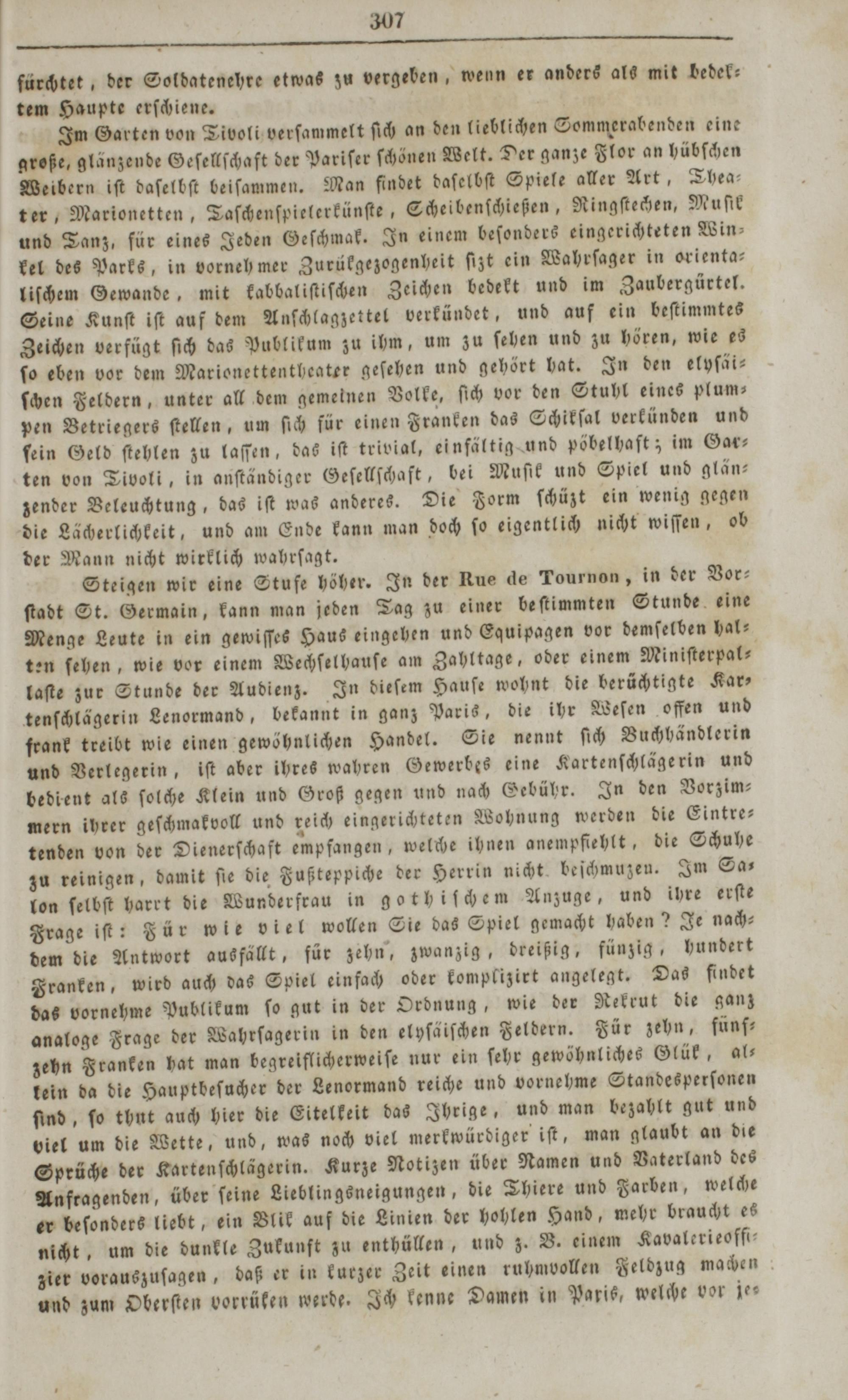Im Garten von Tivoli verſammelt ſich an den lieblichen Sommerabenden eine große, glänzende Geſellſchaft der Pariſer ſchönen Welt. Der ganze Flor an hübſchen Weibern iſt daſelbſt beiſammen. Man findet daſelbſt Spiele aller Art, Thea— ter, Marionetten, Taſchenſpielerkünſte, Scheibenſchießen, Ningſtechen, Muſik und Tanz, für eines Jeden Geſchmak. In einem beſonders eingerichteten Win— kel des Parks, in vorneh mer Zurükgezogenheit ſizt ein Wahrſager in orienta— liſchem Gewande, mit kabbaliſtiſchen Zeichen bedekt und im Zaubergürtel. Seine Kunſt iſt auf dem Anſchlagzettel verkündet, und auf ein beſtimmtes Zeichen verfügt ſich das Publikum zu ihm, um zu ſehen und zu hören, wie es ſo eben vor dem Marionettentheater geſehen und gehört hat. In den elyſäi— ſchen Feldern, unter all dem gemeinen Volke, ſich vor den Stuhl eines plum⸗ pen Betriegers ſtellen, um ſich für einen Franken das Schikſal verkünden und ſein Geld ſtehlen zu laſſen, das iſt trivial, einfältigsund pöbelhaft; im Gar— ten von Tivoli, in anſtändiger Geſellſchaft, bei Muſik und Spiel und glän— zender Beleuchtung, das iſt was anderes. Die Form ſchüzt ein wenig gegen die Lächerlichkeit, und am Ende kann man doch ſo eigentlich nicht wiſſen, ob der Mann nicht wirklich wahrſagt.