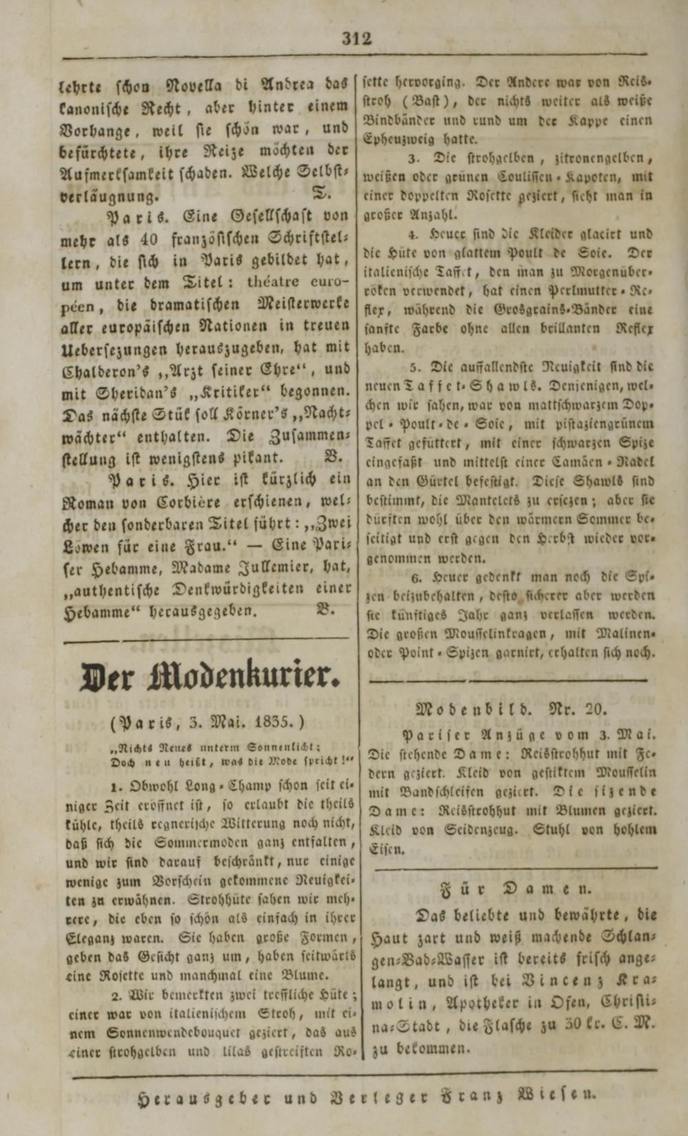 lehrte ſchon Novella di Andrea das kanoniſche Recht, aber hinter einem Vorhange, weil ſie ſchön war, und befürchtete, ihre Reize möchten der Aufmerkſamkeit ſchaden. Welche Selbſt⸗ verläugnung. T. Paris. Eine Geſellſchaſt von mehr als 40 franzöſiſchen Schriftſtel⸗ lern, die ſich in Paris gebildet hat, um unter dem Titel: théatre euro- peen, die dramatiſchen Meisterwerke aller europäiſchen Nationen in treuen Ueberſezungen herauszugeben, hat mit Chalderon's„Arzt ſeiner Ehre“, und mit Sheridan's„Kritiker“ begonnen. Das nächſte Stük ſoll Körner's„Nacht⸗ wächter“ enthalten. Die Zuſammen⸗ ſtellung iſt wenigſtens pikant. B. Paris. Hier iſt kürzlich ein Noman von Corbière erſchienen, wel⸗ cher den ſonderbaren Titel führt:„Zwei Lowen für eine Frau.“— Eine Paxi⸗ ſer Hebamme, Madame Jullemier, hat, „authentiſche Denkwürdigkeiten einer Hebamme“ herausgegeben. B.
