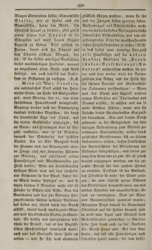 Wien(15. Mai). Ottokrin, ein anſehnliches Dorf nächſt der Herr— nalſer⸗Linie, am Fuße des Galizienber⸗ ges, ward Montag, den 11., von einer furchtbaren Feuersbrunſt heimgeſucht. Sonntag vorher noch der Tummelplaz tauſend fröhlicher Menſchen, die durch die freundliche Lage des Ortes, und die vielen Gaſthäuſer angezogen, ſich an Sonn⸗ und Feiertagen hier in Un— zahl einfinden, war es 24 Stunden darnach der Schauplaz des höchſten Elends. Um 10 Uhr Morgens brach die Flamme aus, der Sturmgloke eher— ne Zunge rief mit heulender Stimme zur Rettung, und pfeilſchnell eilten Feuerſprizen und Menſchenmaſſen zur Hilfe herbei. Aber ein fortwährender heftiger Wind trat mit dem furchtba— ren Elemente in den Bund, fachte ſei— ne Wuth immer heftiger an, und ſo lagen binnen 5 Stunden mehr als 60 Häuſer in Schutt und Aſche. Von den Bewohnern und den zur Rettung Her— zugeſtrömten büßten mehrere Perſonen das Leben ein, theils durch den Rauch erſtikt, theils durch umſtürzende Mau⸗ ern und herabfallende Balken zerſchmet— tert. So heftig und unbezähmbar wü⸗ thete die Brunſt, daß es den Unglük⸗ lichen ſchlechterdings unmöglich ward, auch nur das Geringſte ihrer Habe zu retten— und ſie ſich noch obendrein