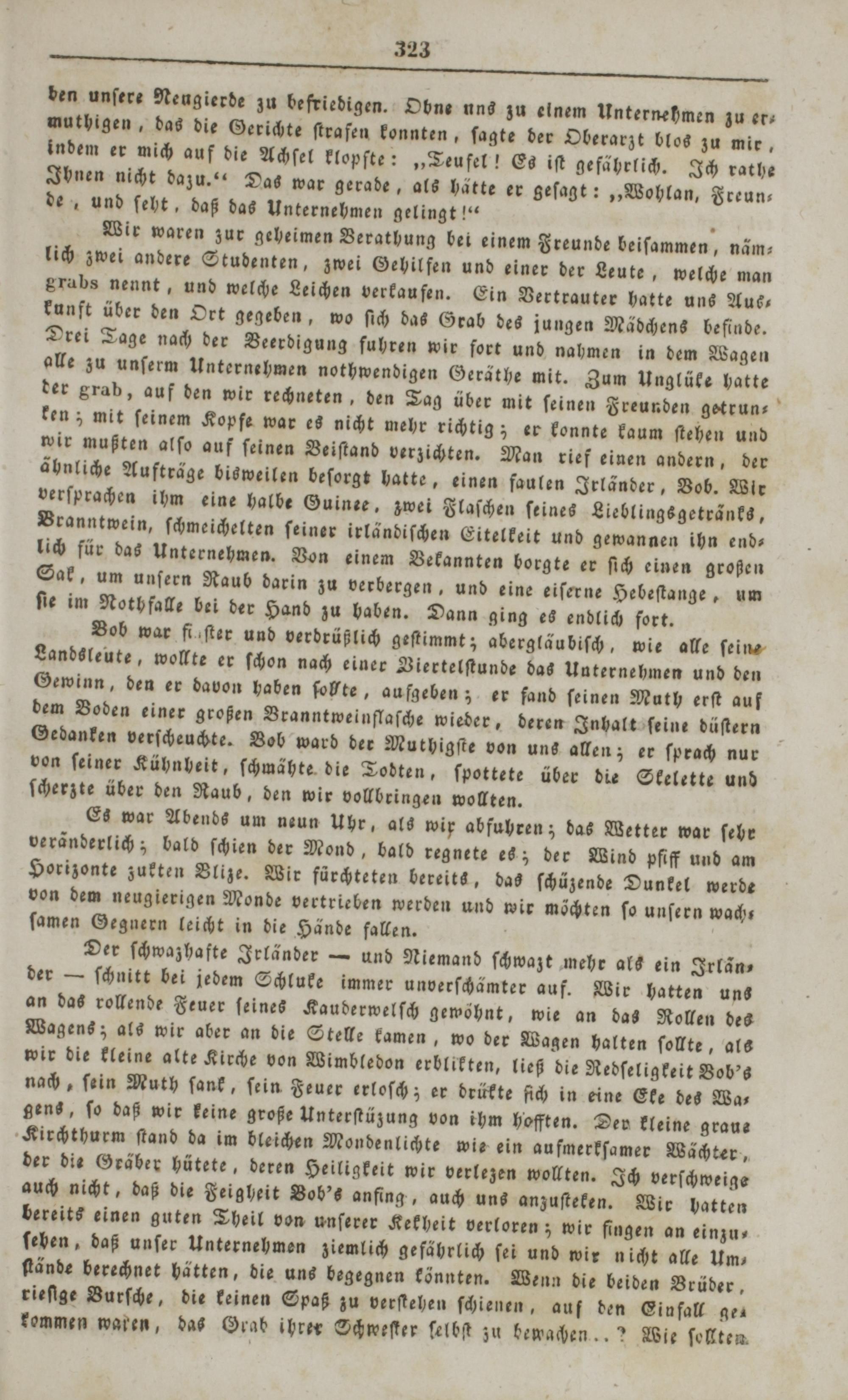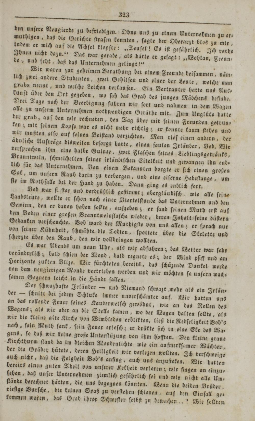 Wir waren zur geheimen Berathung bei einem Freunde beiſammen, näm⸗ lich zwei andere Studenten, zwei Gehilfen und einer der Leute, welche man grabs nennt, und welche Leichen verkaufen. Ein Vertrauter hatte uns Aus— kunft über den Ort gegeben, wo ſich das Grab des jungen Mädchens befinde. Drei Tage nach der Beerdigung fuhren wir fort und nahmen in dem Wagen alle zu unſerm Unternehmen nothwendigen Geräthe mit. Zum Unglüke hatte der grab, auf den wir rechneten, den Tag über mit ſeinen Freunden getrun⸗ ken; mit ſeinem Kopfe war es nicht mehr richtig; er konnte kaum ſtehen und wir mußten alſo auf ſeinen Veiſtand verzichten. Man rief einen andern, der ähnliche Aufträge bisweilen beſorgt hatte, einen faulen Irländer, Vob. Wir verſprachen ihm eine halbe Guinee, zwei Flaſchen ſeines Lieblingsgetraͤnks, Branntwein, ſchmeichelten ſeiner irländiſchen Eitelkeit und gewannen ihn end— lich für das Unternehmen. Von einem Bekannten borgte er ſich einen großen Sak, um unſern Raub darin zu verbergen, und eine eiſerne Hebeſtange, um ſie im Nothfalle bei der Hand zu baben. Dann ging es endlich fort.