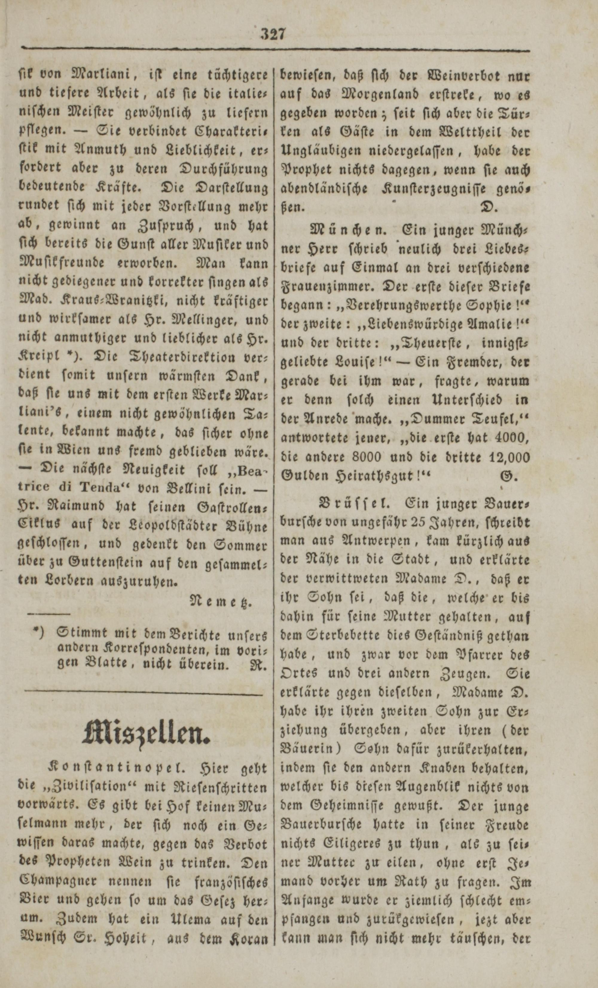 bewieſen, daß ſich der Weinverbot nur auf das Morgenland erſtreke, wo es gegeben worden; ſeit ſich aber die Tür⸗ ken als Gäſte in dem Welttheil der Ungläubigen niedergelaſſen, habe der Prophet nichts dagegen, wenn ſie auch abendländiſche Kunſterzeugniſſe genö— ßen. 7 D. München. Ein junger Münch⸗ ner Herr ſchrieb neulich drei Liebes— briefe auf Einmal an drei verſchiedene Frauenzimmer. Der erſte dieſer Briefe begann:„Verehrungswerthe Sophie!“ der zweite:„Liebenswürdige Amalie!“ und der dritte:„Theuerſte, innigſt— geliebte Louiſe!“— Ein Fremder, der gerade bei ihm war, fragte, warum er denn ſolch einen Unterſchied in der Anrede mache.„Dummer Teufel,“ antwortete jener,„die erſte hat 4000, die andere 8000 und die dritte 12,000 Gulden Heirathsgut!“ G.