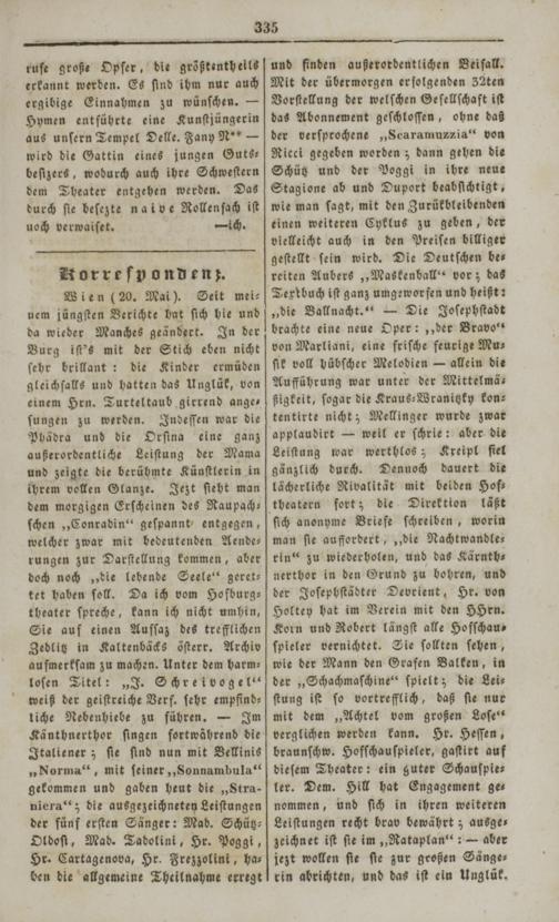 und finden außerordentlichen Beifall. Mit der übermorgen erfolgenden 32ten Vorſtellung der welſchen Geſellſchaft iſt das Abonnement geſchloſſen, ohne daß der verſprochene„Scaramuzzia“ von Ricci gegeben worden; dann gehen die Schütz und der Poggi in ihre neue Stagione ab und Duport beabſichtigt, wie man ſagt, mit den Zurükbleibenden einen weiteren Cyklus zu geben, der vielleicht auch in den Preiſen billiger geſtellt ſein wird. Die Deutſchen be⸗ reiten Aubers„Maskenball“ vor; das Textbuch iſt ganz umgeworfen und heißt: „die Ballnacht.“— Die Joſephſtadt brachte eine neue Oper:„der Bravo“ von Marliani, eine friſche feurige Mu⸗ ſie voll bübſcher Melodien— allein die Aufführung war unter der Mittelmä— ßigkeit, ſogar die Kraus-Wranitzky kon⸗ tentirte nicht; Mellinger wurde zwar applaudirt— weil er ſchrie: aber die Leiſtung war werthlos; Kreipl ſiel gänzlich durch. Denuoch dauert die lächerliche Rivalität mit beiden Hof—⸗ die Direktion läßt ſich anonyme Briefe ſchreiben, worin man ſie auffordert,„die Nachtwandle— rin“ zu wiederholen, und das Kärnth⸗ nerthor in den Grund zu bohren, und der Joſephſtädter Devrient, Hr. von Holtey hat im Verein mit den HHrn. Korn und Robert längſt alle Hofſchau⸗ ſpieler vernichtet. Sie ſollten ſehen, wie der Mann den Grafen Balken, in der„Schachmaſchine“ ſpielt; die Lei⸗ ſtung iſt ſo vortrefflich, daß ſie nur mit dem„Achtel vom großen Loſe“ verglichen werden kann. Hr. Heſſen, braunſchw. Hofſchauſpieler, gaſtirt auf dieſem Theater: ein guter Schauſpie⸗ ler. Dem. Hill hat Engagement ge⸗ nommen, und ſich in ihren weiteren Leiſtungen recht brab bewährt; ausge⸗ zeichnet iſt ſie im„Rataplan“:— aber jezt wollen ſie ſie zur großen Sänge⸗ rin abrichten, und das iſt ein Unglük.