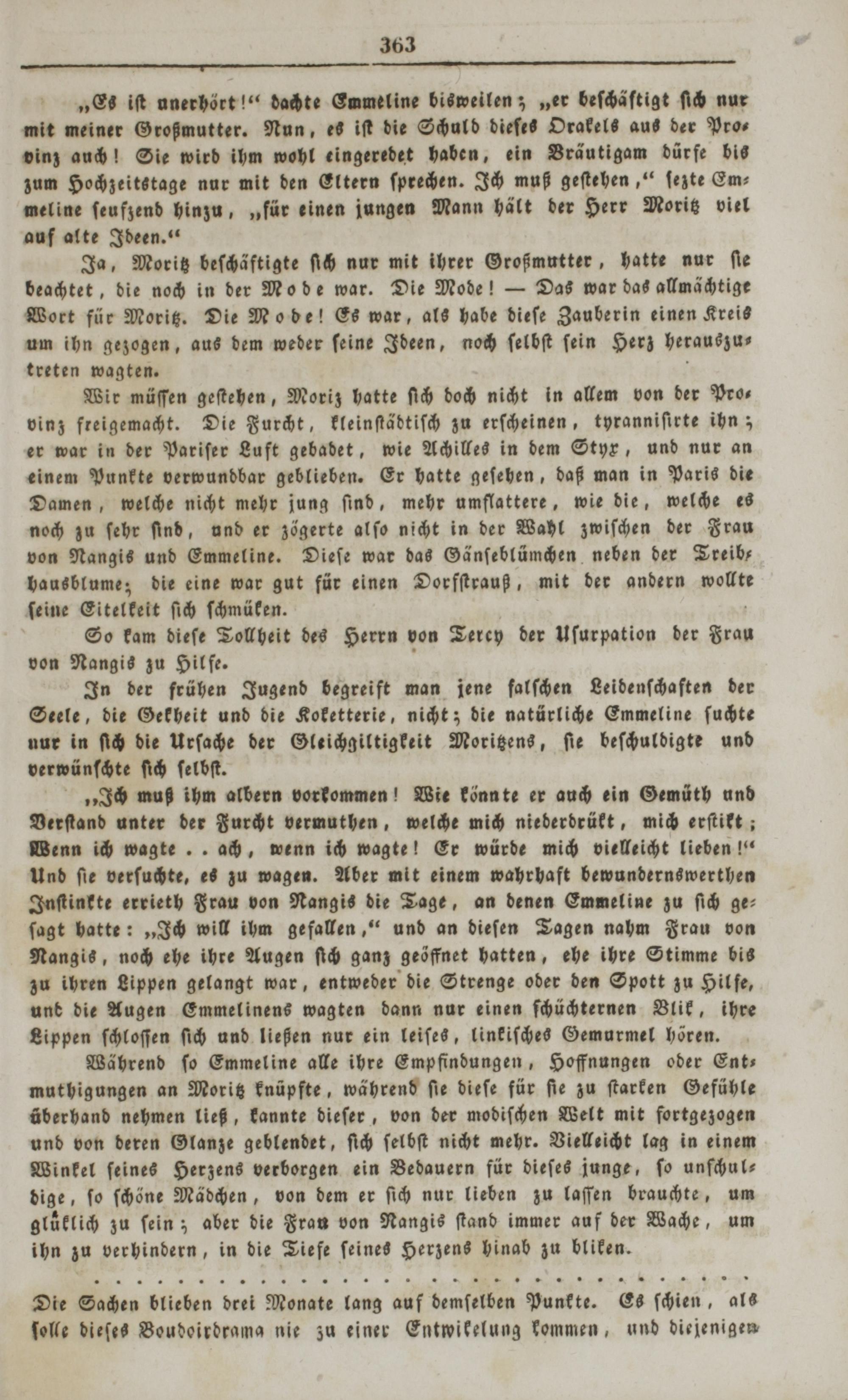 Während ſo Emmeline alle ihre Empfindungen, Hoffnungen oder Ent— muthigungen an Moritz knüpfte, während ſie dieſe für ſie zu ſtarken Gefühle überhand nehmen ließ, kannte dieſer, von der modiſchen Welt mit fortgezogen und von deren Glanze geblendet, ſich ſelbſt nicht mehr. Vielleicht lag in einem Winkel ſeines Herzens verborgen ein Bedauern für dieſes junge, ſo unſchul⸗ dige, ſo ſchöne Mädchen, von dem er ſich nur lieben zu laſſen brauchte, um gluͤklich zu ſein; aber die Fraun von Nangis ſtand immer auf der Wache, um ihn zu verhindern, in die Tiefe ſeines Herzens hinab zu bliken.