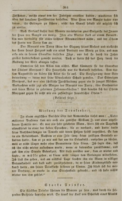 In einem engliſchen Berichte über das Armenweſen lieſet man:„Unter mehreren Perſonen kam mir auch ein gewiſſer William J. aus einer angeſe⸗ benen Familie vor. Er war ein ſehr gelehrter Mann, hielt ſich ein Tagebuch abwechſelnd in einer der ſieben Sprachen, die er verſtand, und hatte darin ſeine Ausſchwelfungen im Trunke und deren Folgen ſelbſt angeführt. Er kam in ein Arbeitshaus. Nachdem er eine Zeit lang keine geiſtigen Getränke er⸗ bal ten hatte, kam er zu mir und bat um die Erlaubniß, ausgehen zu dür fen. weil er nicht länger mehr ohne Branntwein ſein könne. Ich ſagte ihm, daß ich ihn nicht wieder aufnehmen werde, wenn er betrunken zurükkomme, und gab ihm eine Stunde Bedenkzeit. Als dieſe vorüber war, kam er wieder und ſagte, er müſſe gehen, er könne nicht länger dem Verlangen widerſtehen. Ich ließ ihn gehen, und am nächſten Tage brachte ibn ein Mann in völliger Betrunkenheit und balb nakt zurükzefahren, da er ſeine Kleidungsſtäke ver⸗ kauft hatte, um ſeiner Trinkſucht fröhnen zu können. Ich blieb feſt bei mei⸗ ner Drohung, er wurde in eine Strafanſtalt gebracht, und ich habe nichts wieder von ihm gehört.“