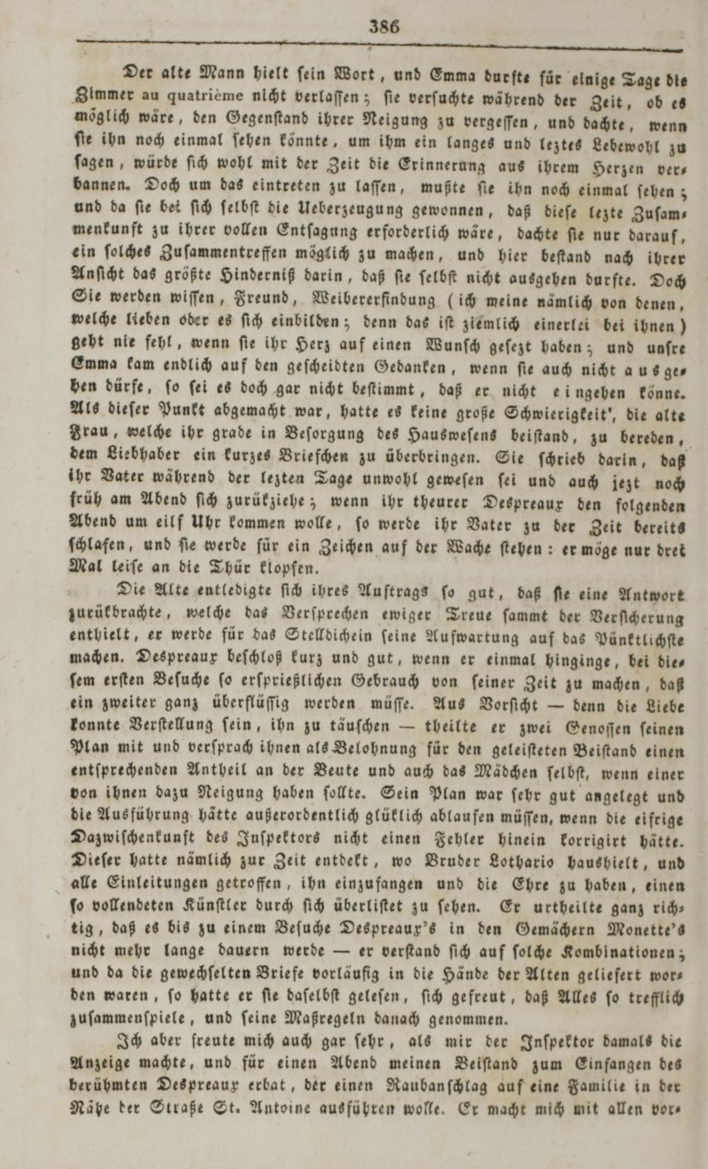 Die Alte entledigte ſich ihres Auſtrags ſo gut, daß ſe eine Antwort zurük brachte, welche das Verſprechen ewiger Treue ſammt der Ver ſicherung enthielt, er werde für das Stelldichein ſeine Aufwartung auf das Pünktlichſte machen. Despreaux beſchloß kurz und gut, wenn er einmal hinginge, bei die⸗ ſem erſten Beſuche ſo erſprießlichen Gebrauch von ſeiner Zeit zu machen, daß ein zweiter ganz überflüſſig werden müſſe. Aus Vorſicht— denn die Liebe konnte Verſtellung ſein, ihn zu täuſchen— theillte er zwei Genoſſen ſeinen Plan mit und verſprach ihnen als Belohnung für den geleiſteten Beiſtand einen entſprechenden Antheil an der Beute und auch das Mädchen ſelbſt, wenn einer von ihnen dazu Neigung haben ſollte. Sein Plan war ſehr gut angelegt und die Ausführung hätte außerordentlich glüklich ablaufen müſſen, wenn die eifrige Dazwiſchenkunft des Inſpektors nicht einen Fehler hinein korrigirt hätte. Dieſer hatte nämlich zur Zeit entdekt, wo Bruder Lothario haushielt, und alle Einleitungen getroffen, ihn einzufangen und die Ehre zu haben, einen ſo vollendeten Künſtler durch ſich überliſtet zu ſehen. Er urtheilte ganz rich⸗ tig, daß es bis zu einem Beſuche Despreaux's in den Gemächern Monette's nicht mehr lange dauern werde— er verſtand ſich auf ſolche Kombinationen; und da die gewechſelten Briefe vorläufig in die Hände der Alten geliefert wor— den waren, ſo hatte er ſie daſelbſt geleſen, ſich gefreut, daß Alles ſo trefflich zuſammenſpiele, und ſeine Maßregeln danach genommen.