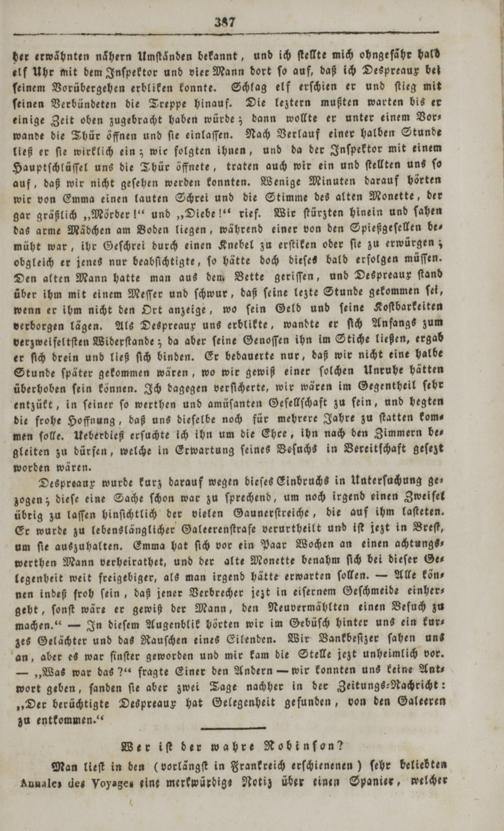 Despreaux wurde kurz darauf wegen dieſes Einbruchs in Unterſachung ge⸗ zogen; dieſe eine Sache ſchon war zu ſprechend, um noch irgend einen Zweifel übrig zu laſſen hinſichtlich der vielen Gaunerſtreiche, die auf ihm laſteten. Er wurde zu lebenslänglicher Galeerenſtrafe verurtheilt und iſe jezt in Breſt, um ſie auszuhalten. Emma hat ſich vor ein Paar Wochen an einen achtungs⸗ werthen Mann verheirathet, und der alte Monette benahm ſich bei dieſer Ge⸗ legenheit weit freigebiger, als man irgend hätte erwarten ſollen.— Alle kön⸗ nen indeß froh ſein, daß jener Verbrecher jezt in eiſernem Geſchmeide einher⸗ geht, ſonſt wäre er gewiß der Mann, den Neuvermählten einen Beſuch zu machen.“— In dieſem Augenblik hörten wir im Gebüſch hinter uns ein kur⸗ zes Gelächter und das Rauſchen eines Eilenden. Wir Bankbeſizer ſahen uns an aber es war finſter geworden und mir kam die Stelle jezt unheimlich vor. —„Was war das?“ fragte Einer den Andern— wir konnten uns keine Ant⸗ wort geben, fanden ſie aber zwei Tage nachher in der Zeitungs⸗Nachricht: „Der berüchtigte Despreaux hat Gelegenheit gefunden, von den Galeeren zu entkommen.“