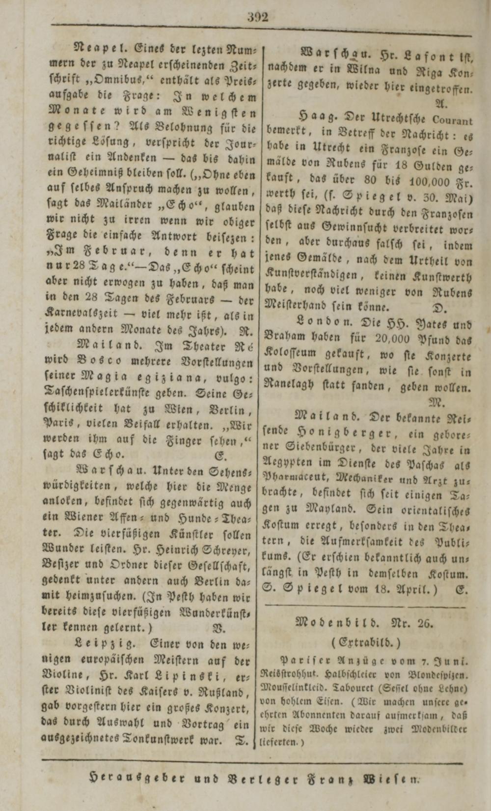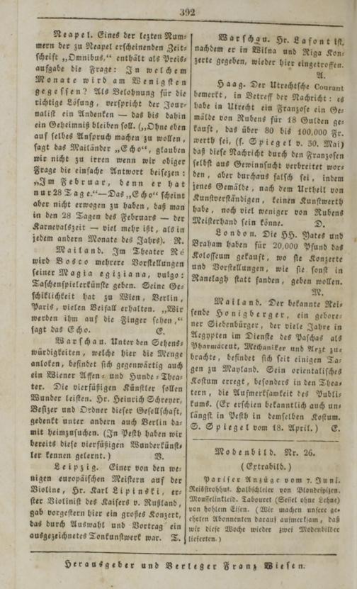 Mailand. Der bekannte Rei⸗ ſende Honigberger, ein gebore⸗ ner Siebenbürger, der viele Jahre in Aegypten im Dienſte des Paſchas als Pharmaceut, Mechaniker und Arzt zu⸗ brachte, befindet ſich ſeit einigen Ta⸗ gen zu Mayland. Sein orientaliſches Koſtum erregt, beſonders in den Thea⸗ tern, die Aufmerkſamkeit des Publi⸗ kums.(Er erſchien bekanntlich auch un— längſt in Peſth in demſelben Koſtum. S. Spiegel vom 18. April.) E.