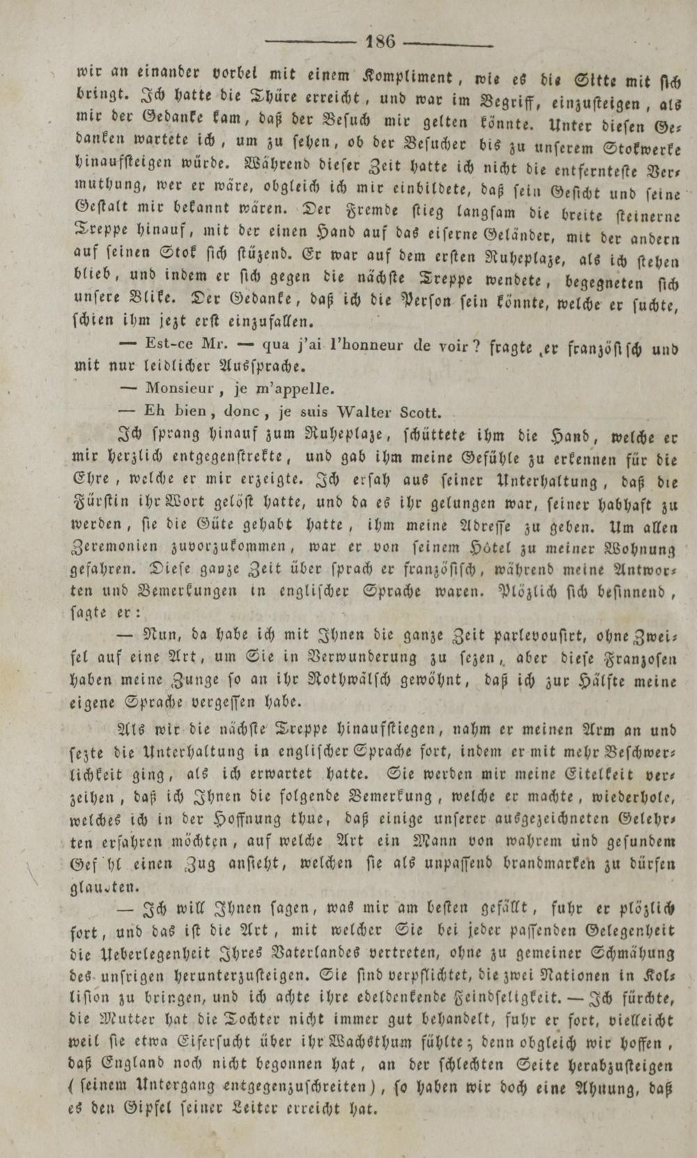Ich ſprang hinauf zum Ruheplaze, ſchüttete ihm die Hand, welche er mir herzlich entgegenſtrekte, und gab ihm meine Gefühle zu erkennen für die Ehre, welche er mir erzeigte. Ich erſah aus ſeiner Unterhaltung, daß die Fürſtin ihr Wort gelöſt hatte, und da es ihr gelungen war, ſeiner habhaft zu werden, ſie die Güte gehabt hatte, ihm meine Adreſſe zu geben. Um allen Zeremonien zuvorzukommen, war er von ſeinem Hötel zu meiner Wohnung gefahren. Dieſe ganze Zeit über ſprach er franzöſiſch, während meine Antwor— ten und Bemerkungen in engliſcher Sprache waren. Plöhzlich ſich beſinnend, ſagte er: