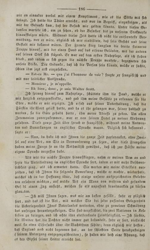 Als wir die nächſte Treppe hinaufſtiegen, nahm er meinen Arm an und ſezte die Unterhaltung in engliſcher Sprache fort, indem er mit mehr Beſchwer⸗ lichkeit ging, als ich erwartet hatte. Sie werden mir meine Eitelkeit ver— zeihen, daß ich Ihnen die folgende Bemerkung, welche er machte, wiederhole, welches ich in der Hoffnung thue, daß einige unſerer ausgezeichneten Gelehr— ten erfahren möchten, auf welche Art ein Mann von wahrem und geſundem Gefühl einen Zug anſteht, welchen ſie als unpaſſend brandmarken zu dürfen glausten. 1 1518