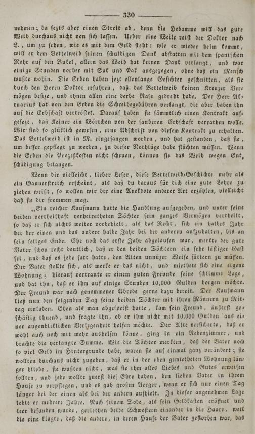 nehmen; da ſezts aber einen Streit ab, denn die Hebamme will das gute Weib durchaus nicht von ſich laſſen. Ueber eine Weile reiſt der Doktor nach L., um zu ſehen, wie es mit dem Geld ſteht: wie er wieder heim kommt, will er dem Bettelweib ſeinen ſchuldigen Dank abſtatten mit dem ſpaniſchen Rohr auf den Bukel, allein das Weib hat keinen Dank verlangt, und war einige Stunden vorher mit Sak und Pak ausgezogen, ohne daß ein Menſch wußte wohin. Die Erben haben jezt ellenlange Geſichter geſchnitten, als ſie durch den Herrn Doktor erfuhren, daß; das Vettelweib keinen Kreuzer Ver— mögen beſize, und ihnen allen eine derbe Naſe gedreht habe. Der Herr Ak— tuarius hat von den Erben die Schreibegebühren verlangt, die aber haben ihn auf die Erbſchaft vertröſtet. Darauf haben ſie ſämmtlich einen Kontrakt auf— geſezt, daß Keiner ein Wörtchen von der ſauberen Erbſchaft verrathen wolle. Wir ſind ſo glüklich geweſen, eine Abſchrift von dieſem Kontrakt zu erhalten. Das Bettelweib iſt in M. eingefangen worden, und hat geſtanden, daß ſie, um beſſer gepflegt zu werden, zu dieſer Nothlüge habe flüchten müſſen. Wenn die Erben die Prozeßkoſten nicht ſcheuen, können ſie das Weib wegen Ent, ſchädigung belangen.