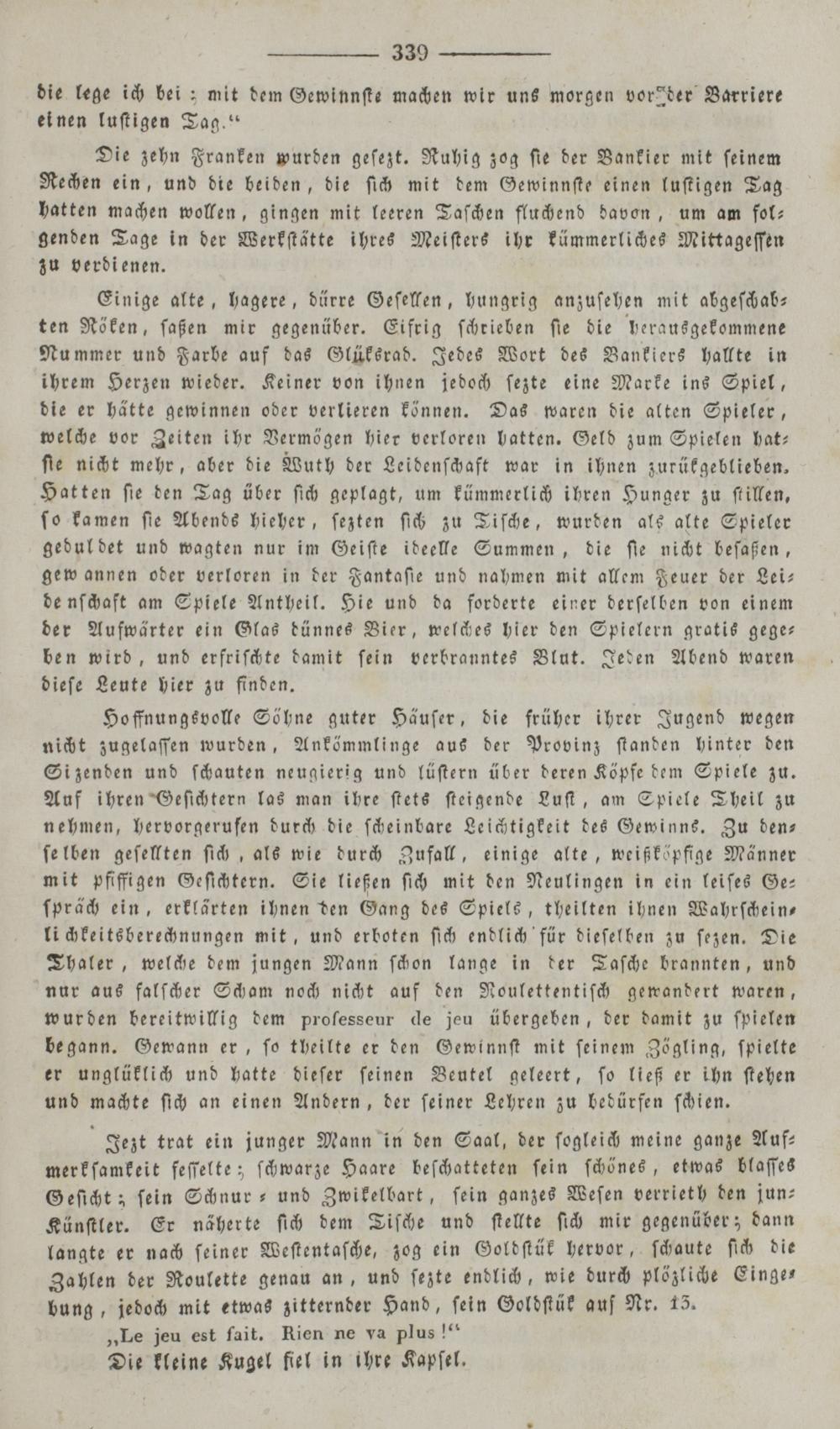 Hoffnungsvolle Söhne guter Häuſer, die früher ihrer Jugend wegen nicht zugelaſſen wurden, Ankömmlinge aus der Provinz ſtanden hinter den Si zenden und ſchauten neugierig und lüſtern über deren Köpfe dem Spiele zu. Auf ihren Geſichtern las man ihre ſtets ſteigende Luſt, am Spiele Theil zu nehmen, hervorgerufen durch die ſcheinbare Leichtigkeit des Gewinns. Zu den— ſe lben geſellten ſich, als wie durch Zufall, einige alte, weißköpfige Männer mit pfiffigen Geſichtern. Sie ließen ſich mit den Neulingen in ein leiſes Ge— ſpräch ein, erklärten ihnen den Gang des Spiels, theilten ihnen Wahrſchein— lichkeitsberechnungen mit, und erboten ſich endlich für dieſelben zu ſezen. Die Thaler, welche dem jungen Mann ſchon lange in der Taſche brannten, und nur aus falſcher Scham noch nicht auf den Noulettentiſch gewandert waren, wur den bereitwillig dem proſesseur de jeu übergeben, der damit zu ſpielen begann. Gewann er, ſo theilte er den Gewinnſt mit ſeinem Zögling, ſpielte er unglüklich und hatte dieſer ſeinen Beutel geleert, ſo ließ er ihn ſtehen und machte ſich an einen Andern, der ſeiner Lehren zu bedürfen ſchien.