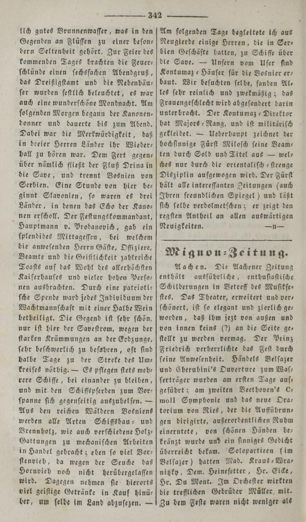 lich gutes Brunnenwaſſer, was in den Gegenden an Flüſſen zu einer beſon— dern Seltenheit gehört. Zur Feier des kommenden Tages brachten die Feuer— ſchlünde einen ſechsfachen Abendgruß, das Oreißigſtamt und die Nebenhäu— ſer wurden feſtlich beleuchtet, es war auch eine wunderſchöne Mondnacht. Am folgenden Morgen begann der Kanonen— donner und dauerte bis zum Abend. Dabei war die Merkwürdigkeit, daß in dreier Herren Länder ihr Wieder— hall zu hören war. Dem Fert gegen— über nämlich fließt der Fluß Drina in die Save, und trennt Vosnien von Serbien. Eine Stunde von hier be— ginnt Slavonien, ſo waren es drei Länder, in denen das Echo der Kano— nen erſcholl. Der Feſtungskommandant, Hauptmann v. Prodanovich, gab ein ſplendides Mittageſſen, bei welchem die anweſenden Herrn Gäſte, Offiziere, Beamte und die Geiſtlichkeit zahlreiche Toaſts auf das Wohl des allerhöchſten Kaiſerhauſes und vieler hohen Perſo— nen ausbrachten. Durch eine patrioti— ſche Spende ward jedes Individuum der Wachtmannſchaft mit einer Halbe Wein betheiligt. Die Gegend iſt ſehr ſchön, nur iſt hier der Saveſtrom, wegen der ſtarken Krümmungen an der Erdzunge, ſehr beſchwerlich zu befahren, oft ſind halbe Tage zu der Streke des Um— kreiſes nöthig.— Es pflegen ſtets meh— rere Schiffe, bei einander zu bleiben, und mit den Schiffspferden zum Vor— ſpanne ſich gegenſeitig auszuhelſen.— Aus den reichen Wäldern Bosniens werden alle Arten Schiffsbau- und Brennholz, wie auch verſchiedene Holz— Gattungen zu mechaniſchen Arbeiten in Handel gebracht; eben ſo viel Vor— ſtenvieh, da wegen der Seuche das Hornvieh noch nicht herübergelaſſen wird. Dagegen nehmen ſie hierorts viel geiſtige Getränke in Kauf hinü— ber, um ſelbe im Land abzuſezen.—