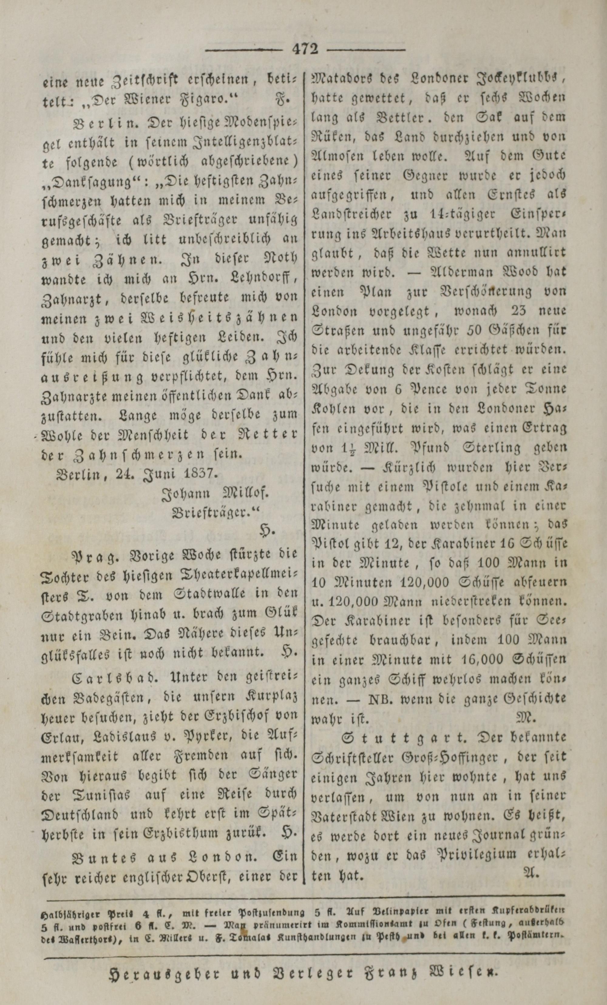 5 fl. und poſtfrei 6 fl. C. M.— Ma det Waflerthort), in C. Millers u. F. T
