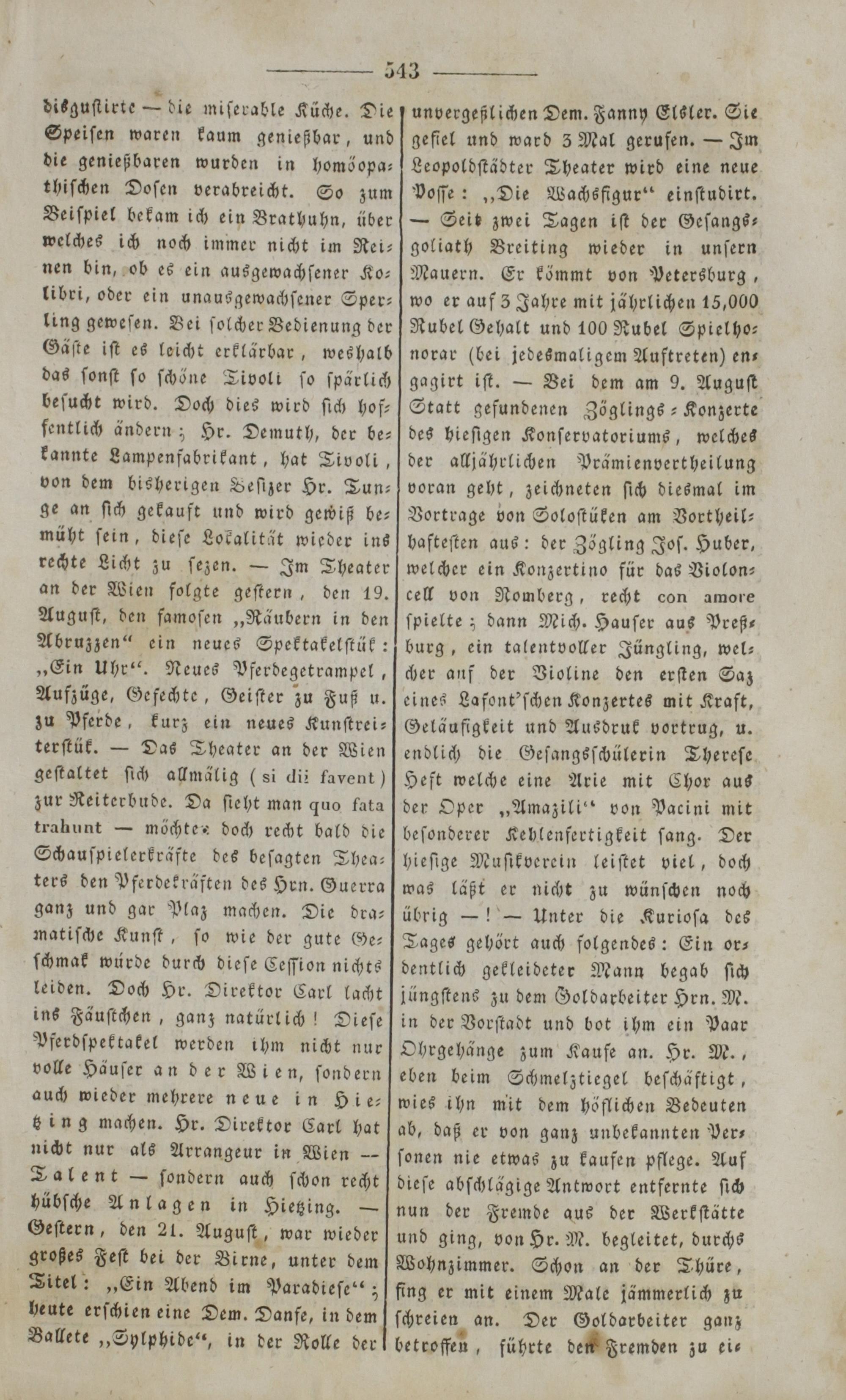 unvergeßlichen Dem. Fanny Elsler. Sie gefiel und ward 3 Mal gerufen.— Im Leopoldſtädter Theater wird eine neue boſſe:„Die Wachsfigur“ einſtudirt. — Seit zwei Tagen iſt der Geſangs— goliath Breiting wieder in unſern Mauern. Er kömmt von Petersburg, wo er auf 5 Jahre mit jährlichen 15,000 Rubel Gehalt und 100 Rubel Spiel ho— norar(bei jedesmaligem Auftreten) en— gagirt iſt.— Bei dem am 9. Auguſt Statt gefundenen Zöglings-Konzerte des hieſigen Konſervatoriums, welches der alljährlichen Prämienvertheilung voran geht, zeichneten ſich diesmal im Vortrage von Soloſtüken am Vortheil bafteſten aus: der Zögling Joſ. Huber, welcher ein Konzertino für das Violon— cell von Nomberg, recht con amore ſpielte; dann Mich. Hauſer aus Preß⸗ burg, ein talentvoller Jüngling, wel— cher auf der Violine den erſten Saz eines Lafont'ſchen Konzertes mit Kraft, Geläufigkeit und Ausdruk vortrug, u endlich die Geſangsſchülerin Thereſe Heft welche eine Arie mit Chor aus der Oper„Amazili“ von Pacini mit beſonderer Kehlenfertigkeit ſang. Der hieſige Muſikverein leiſtet viel, doch was läßt er nicht zu wünſchen noch übrig—!— Unter die Kurioſa des Tages gehört auch folgendes: Ein or— dentlich gekleideter Mann begab ſich jüngſtens zu dem Goldarbeiter Hrn. M. in der Vorſtadt und bot ihm ein Paar Ohrgehänge zum Kaufe an. Hr. M., eben beim Schmelztiegel beſchäftigt, wies ihn mit dem höflichen Vedeuten ab, daß er von ganz unbekannten VPer— ſonen nie etwas zu kaufen pflege. Auf dieſe abſchlägige Antwort entfernte ſich nun der Fremde aus der Werkſtätte und ging, von Hr. M. begleitet, durchs Wohnzimmer. Schon an der Thäre, fing er mit einem Male jämmerlich zu ſchreien an. Der Goldarbeiter ganz betroffen, führte den Fremden zu ei⸗