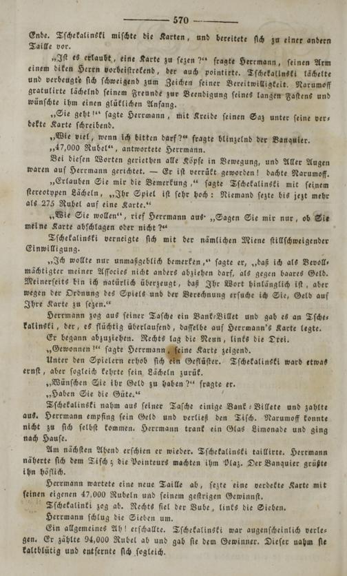Herrmann wartete eine neue Taille ab, ſezte eine verdekte Karte mit ſeinen eigenen 47,000 Rubeln und ſeinem geſtrigen Gewinnſt. Icſchekalinki zog ab. Rechts fiel der Bube, links die Sieben.