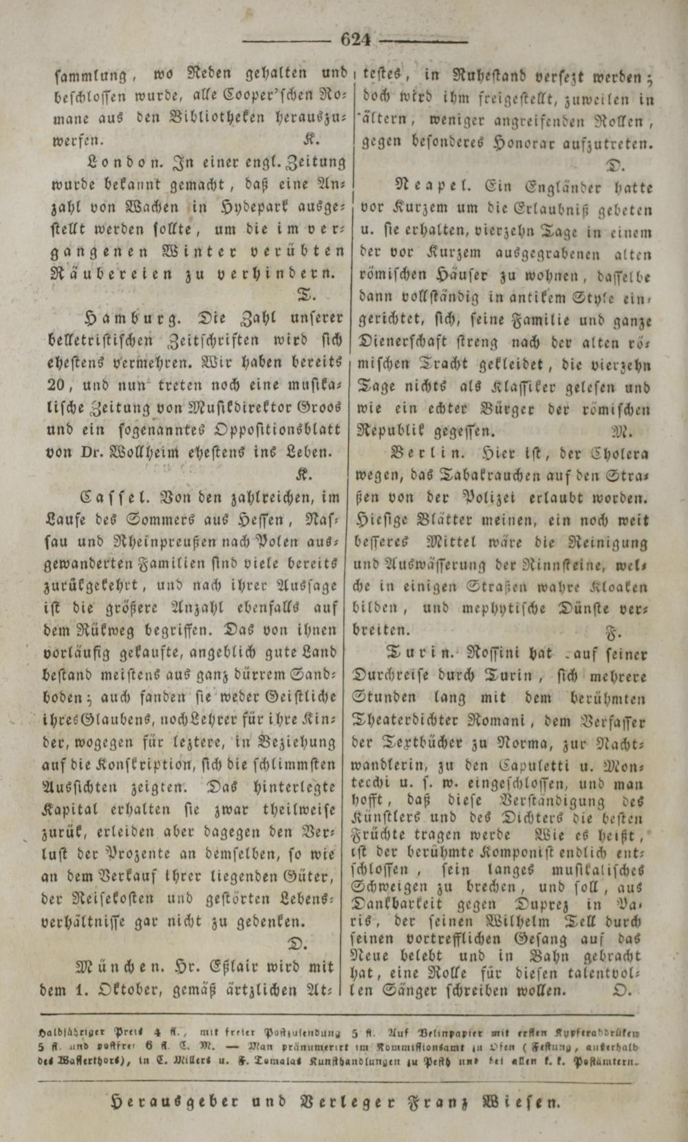 doch werd ihm freigeſtellt, zuwellen in ältern, weniger angreifenden Rollen, gegen beſonderes Honorar aufzutreten. D. Neapel. Ein Engländer hatte vor Kurzem um die Erlaubniß gebeten u. ſie erhalten, vierzehn Tage in einem der vor Kurzem ausgegrabenen alten römiſchen Häuſer zu wohnen, daſſel be dann vollſtändig in antikem Style ein- gerichtet, ſich, ſeine Familie und ganze Dienerſchaft ſtreng nach der alten rö— miſchen Tracht gekleidet, die vierzehn Tage nichts als Klaſſiker geleſen und wie ein echter Bürger der römiſchen Republik gegeſſen. M. Berlin. Hier iſt, der Cholera wegen, das Tabak rauchen auf den Stra— ßen von der Polizei erlaubt worden. Hieſige Blätter meinen, ein noch weit beſſeres Mittel wäre die Reinigung und Auswäſſerung der Rinnſteine, wel che in einigen Straßen wahre Kloaken bilden, und mephytiſche Dünſte ver⸗ breiten. F. Turin. Roſſini hat auf ſeiner Durchreiſe durch Turin, ſich mehrere Stunden lang mit dem berühmten Theaterdichter Romani, dem Verfaſſer der Textbücher zu Norma, zur Nacht—