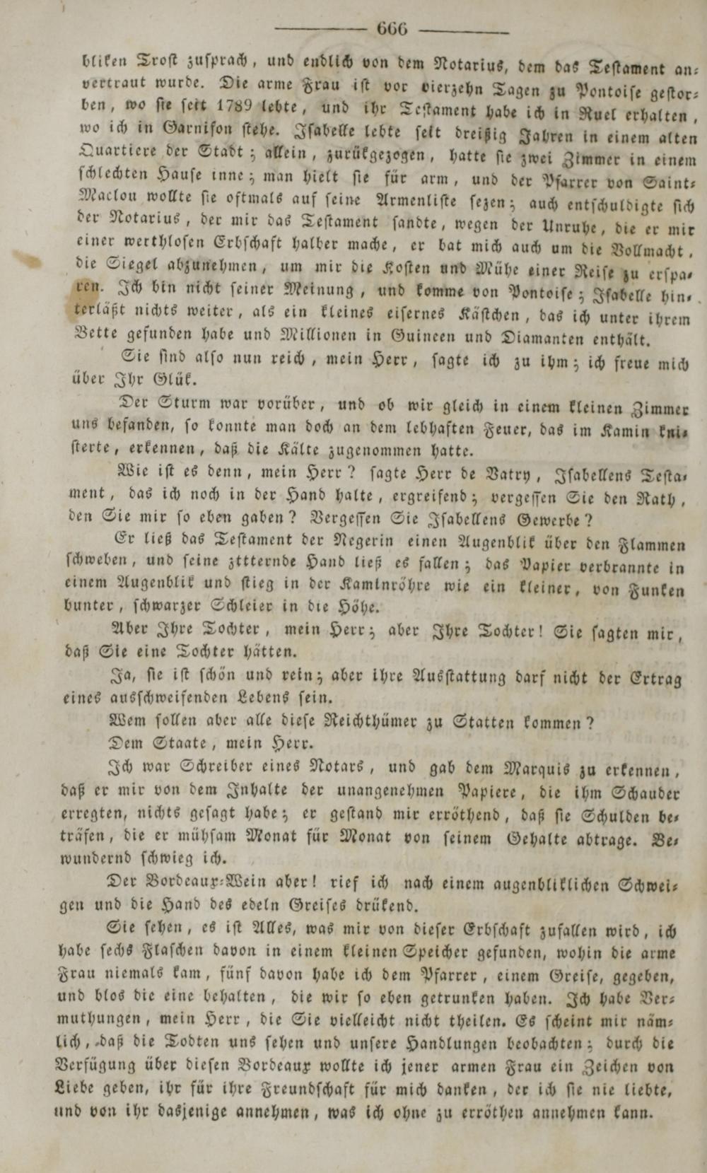 bliken Troſt zuſprach, und endlich von dem Notarius, dem das Teſtament an⸗ vertraut wurde. Die arme Frau iſt vor dierzehn Tagen zu Pontoiſe geſtor⸗ ben, wo ſie ſett 1789 lebte, und ihr Teſtament habe ich in Ruel erhalten, wo ich in Garniſon ſtehe. Iſabelle lebte ſelt dreißig Jahren in einem alten Quartiere der Stadt; allein, zurükgezogen, hatte ſie zwei Zimmer in einem ſchlechten Hauſe inne; man hielt ſie für arm, und der Pfarrer von Saint⸗ Maclou wollte ſie oftmals auf ſeine Armenliſte ſezen; auch entſchuldigte ſich der Notarius, der mir das Teſtament ſandte, wegen der Unruhe, die er mit einer werthloſen Erbſchaft halber mache, er bat mich auch um die Vollmacht, die Siegel abzunehmen, um mir die Koſten und Mühe einer Reiſe zu erſpa⸗ Ich bin nicht ſeiner Meinung, und komme von Pontoiſe; Ifabelle hin⸗ 5 nichts weiter, als ein kleines eiſernes Käſtchen, das ich unter ihrem Bette gefunden habe und Millionen in Guineen und Diamanten ent halt.