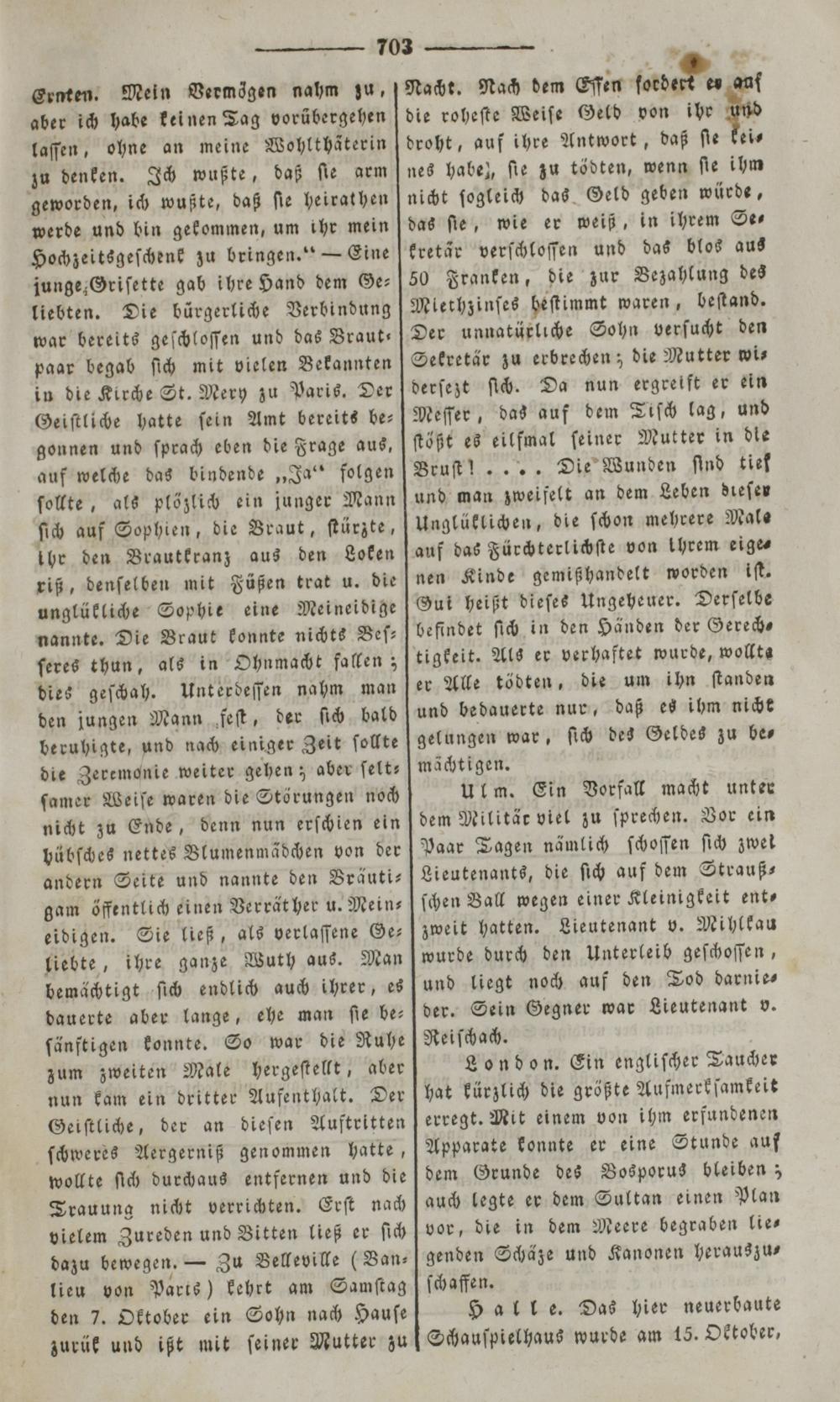 Ernten. Mein Vermögen nahm zu, aber ich habe keinen Tag vorübergehen laſſen, ohne an meine Wohlthäterin zu denken. Ich wußte, daß ſie arm geworden, ich wußte, daß ſie heirat hen werde und bin gekommen, um ihr mein Hochzeitsgeſchenk zu bringen.“— Eine junge, Griſette gab ihre Hand dem Ge— liebten. Die bürgerliche Verbindung war bereits geſchloſſen und das Braut⸗— paar begab ſich mit vielen Bekannten in die Kirche St. Mery zu Paris. Der Geiſtliche hatte ſein Amt bereits be— gonnen und ſprach eben die Frage aus, auf welche das bindende„Ja“ folgen ſollte, als plözlich ein junger Mann ſich auf Sophien, die Braut, ſtürzte, uhr den Brautkranz aus den Loken riß, denſelben mit Füßen trat u. die unglükliche Sophie eine Meineidige nannte. Die Braut konnte nichts Beſ⸗ ſeres thun, als in Ohnmacht fallen; dies geſchah. Unterdeſſen nahm man den jungen Mann feſt, der ſich bald beruhigte, und nach einiger Zeit ſollte die Zeremonie weiter gehen; aber ſelt⸗ ſamer Weiſe waren die Störungen noch nicht zu Ende, denn nun erſchien ein hübſches nettes Blumenmädchen von der andern Seite und nannte den Bräuti⸗ gam öffentlich einen Verrät her u. Mein⸗ eidigen. Sie ließ, als verlaſſene Ge⸗ liebte, ihre ganze Wuth aus. Man bemächtigt ſich endlich auch ihrer, es dauerte aber lange, ehe man ſie be—⸗ ſänftigen konnte. So war die Ruhe zum zweiten Male hergeſtellt, aber nun kam ein dritter Aufenthalt. Der Geiſtliche, der an dieſen Auftritten ſchweres Aergerniß genommen hatte, wollte ſich durchaus entfernen und die Trauung nicht verrichten. Erſt nach vielem Zureden und Bitten ließ er ſich