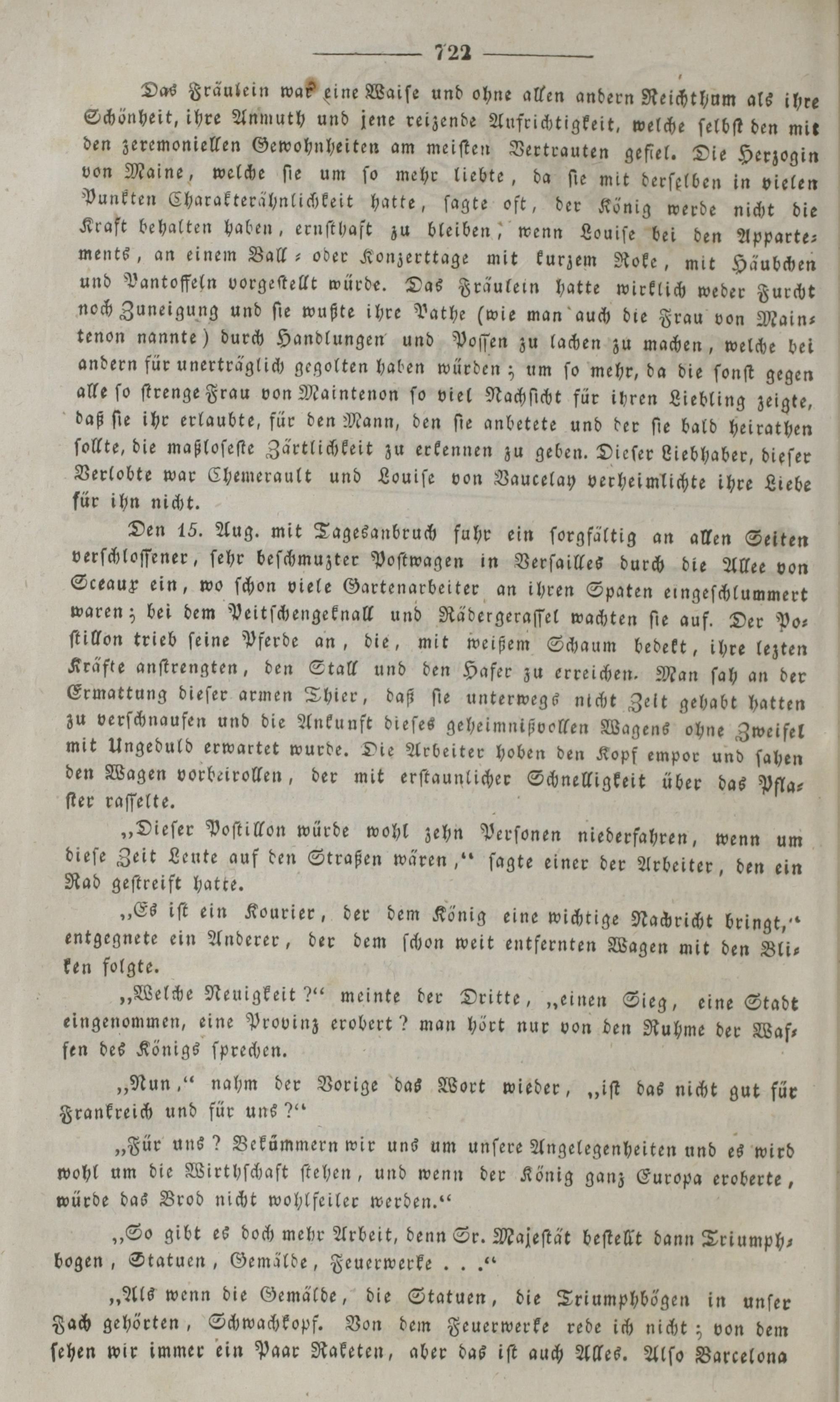 Den 15. Aug. mit Tagesanbruch fuhr ein ſorgfältig an allen Seiten verſchloſſener, ſehr beſchmuzter Poſtwagen in Verſailles durch die Allee von Sceaux ein, wo ſchon viele Gartenarbeiter an ihren Spaten eingeſchlummert waren; bei dem Peitſchengeknall und Rädergeraſſel wachten ſie auf. Der Po—⸗ ſtillon trieb ſeine Pferde an, die, mit weißem Schaum bedekt, ihre lezten Kräfte anſtrengten, den Stall und den Hafer zu erreichen. Man ſah an der Ermattung dieſer armen Thier, daß ſie unterwegs nicht Zelt gehabt hatten zu verſchnaufen und die Ankunft dieſes geheimnißvollen Wagens ohne Zweifel mit Ungeduld erwartet wurde. Die Arbeiter hoben den Kopf empor und ſahen