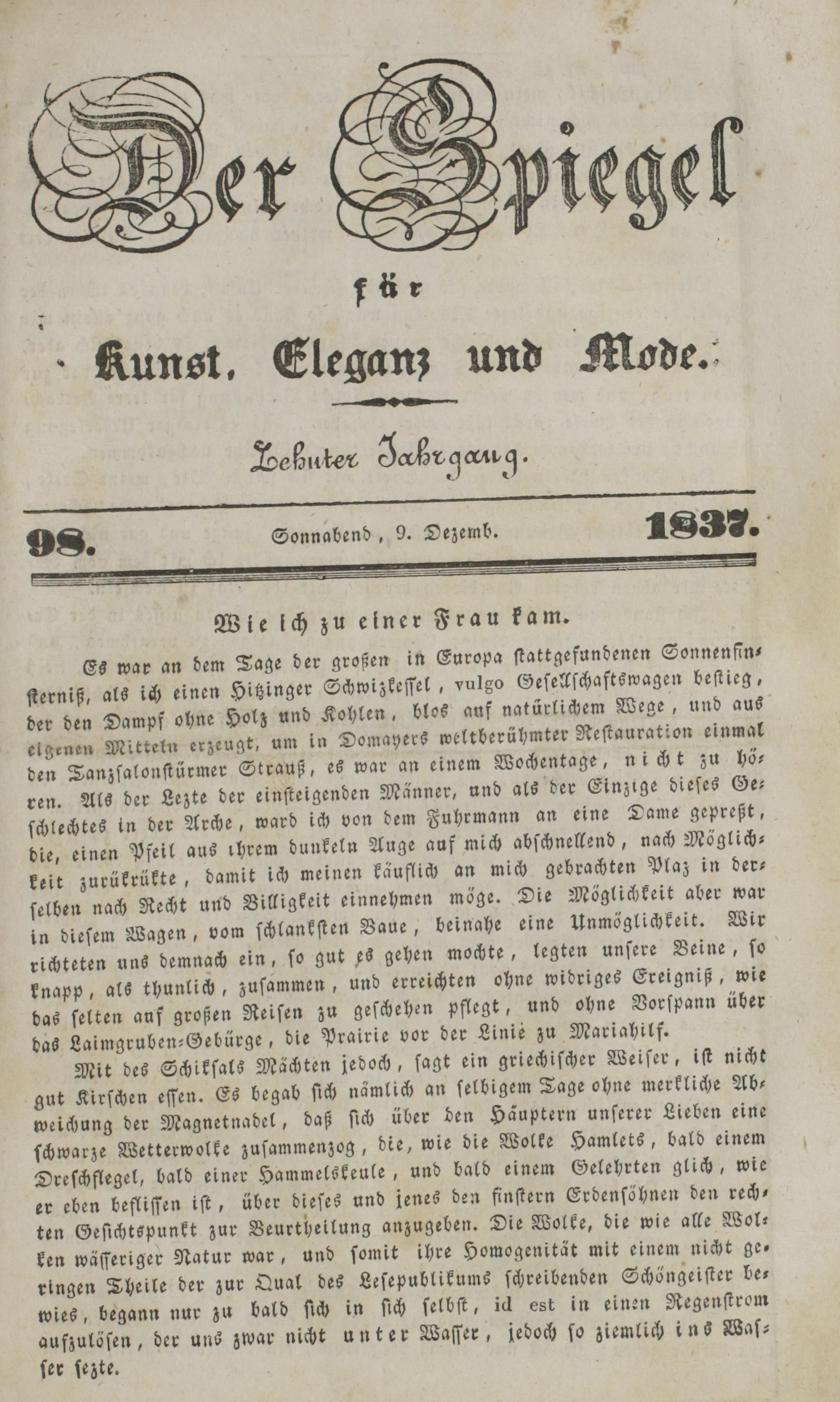 Es war an dem Tage der großen in Europa ſtatt gefundenen Sonnenfin⸗ ſterniß, als ich einen Hitzinger Schwizkeſſel, vulgo Geſellſchaftswagen beſtieg, der den Dampf ohne Holz und Kohlen, blos auf natürlichem Wege, und aus eigenen Mitteln erzeugt, um in Domayers weltberühmter Neſtauration einmal den Tanzſalonſtürmer Strauß, es war an einem Wochentage, nicht zu hö— ren. Als der Lezte der einſteigenden Männer, und als der Einzige dieſes Ge⸗ ſchlechtes in der Arche, ward ich von dem Fuhrmann an eine Dame gepreßt, die, einen Pfeil aus ihrem dunkeln Auge auf mich abſchnellend, nach Möglich⸗ keit zurükrükte, damit ich meinen käuflich an mich gebrachten Plaz in der⸗ ſelben nach Recht und Billigkeit einnehmen möge. Die Möglichkeit aber war in dieſem Wagen, vom ſchlankſten Baue, beinahe eine Unmöglichkeit. Wir richteten uns demnach ein, ſo gut es gehen mochte, legten unſere Beine, ſo knapp, als thunlich, zuſammen, und erreichten ohne widriges Ereigniß, wie das ſelten auf großen Reiſen zu geſchehen pflegt, und ohne Vorſpann über das Laimgruben⸗Gebürge, die Prairie vor der Linie zu Mariahilf.