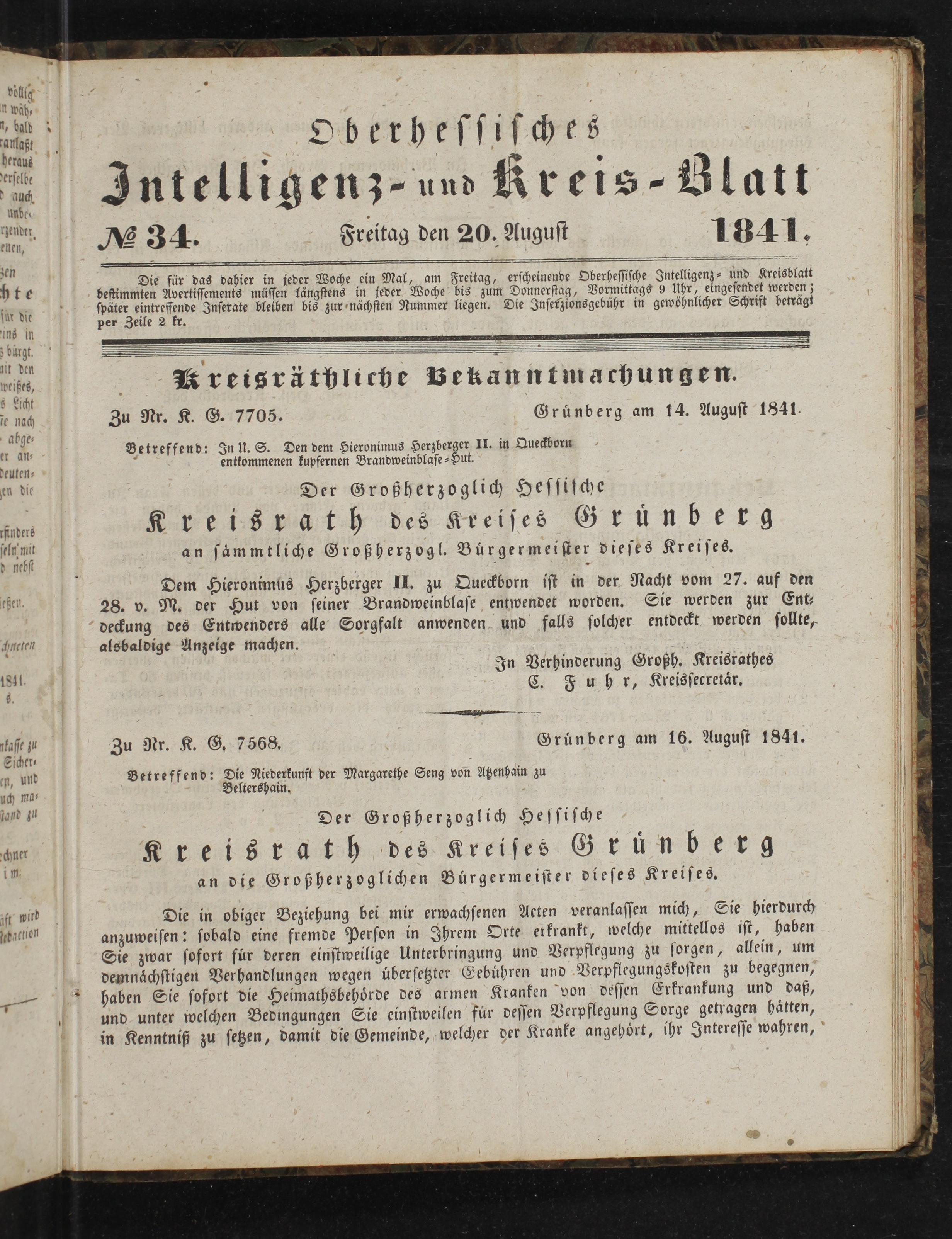 Oberhessisches Intelligenz- und Kreis-Blatt. 1834-1842