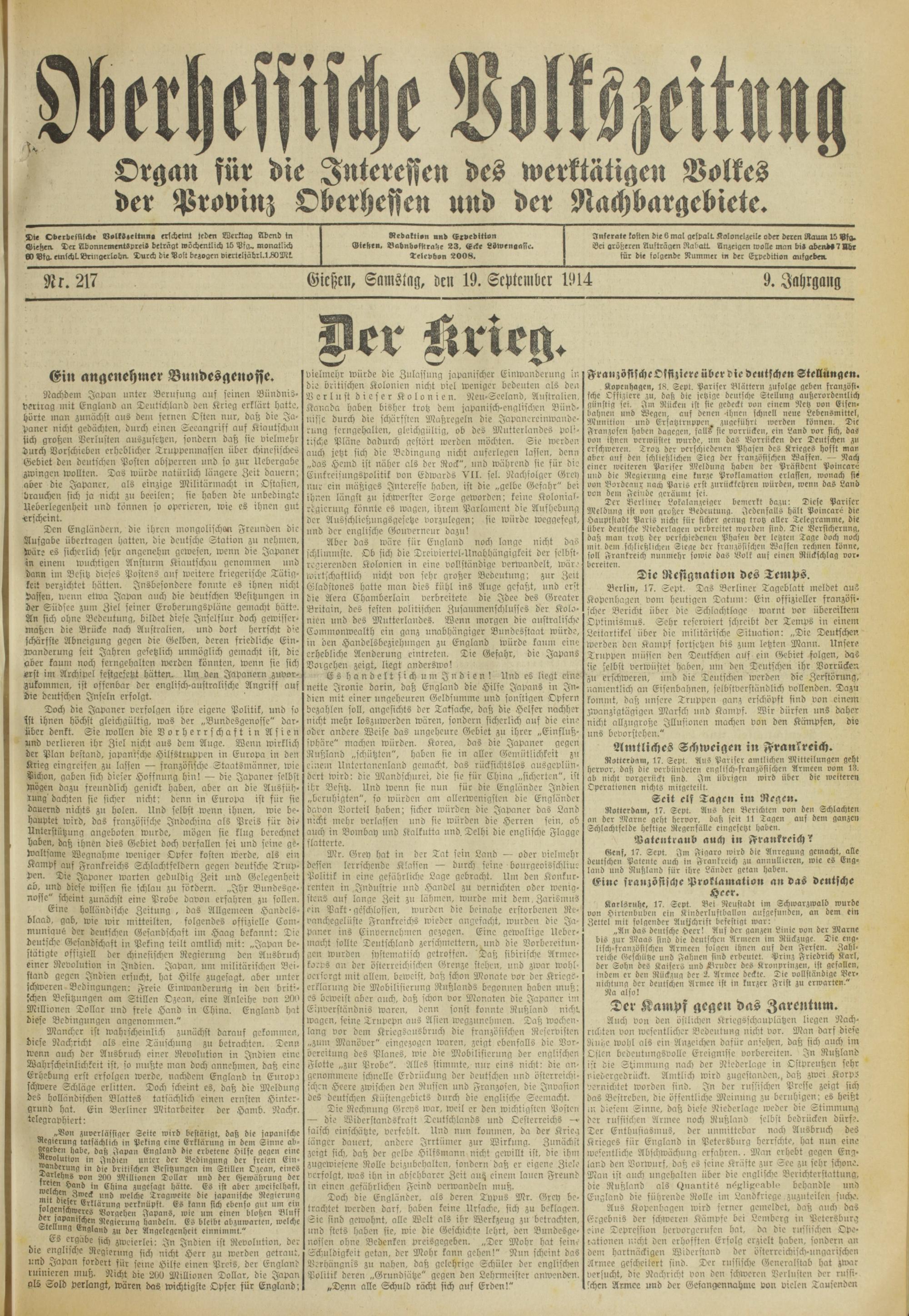 Oberhessische Volkszeitung. 1914-1923