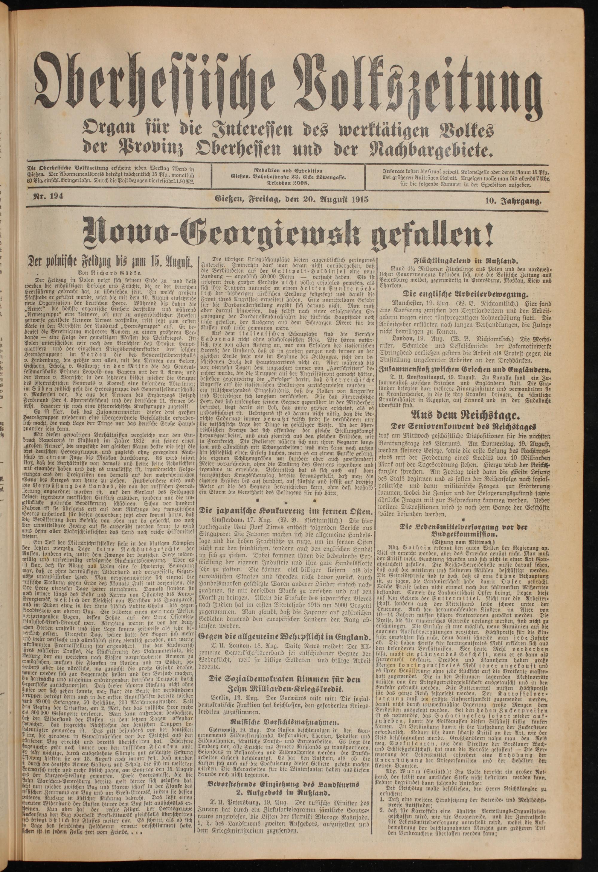 Oberhessische Volkszeitung. 1914-1923