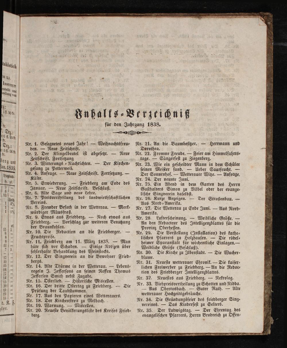 (31.12.1838) Inhaltsverzeichnis
