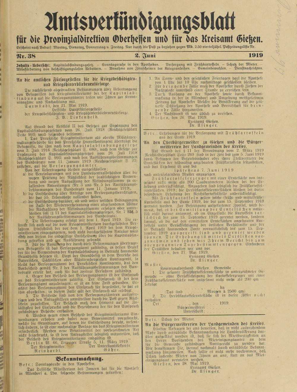 Amtsverkündigungsblatt für die Provinzialdirektion Oberhessen und der Kreisämter Gießen, Friedberg, Büdingen, Lauterbach, Schotten und Alsfeld. 1919-1937