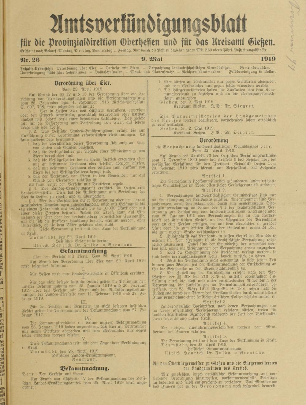 Amtsverkündigungsblatt für die Provinzialdirektion Oberhessen und der Kreisämter Gießen, Friedberg, Büdingen, Lauterbach, Schotten und Alsfeld. 1919-1937