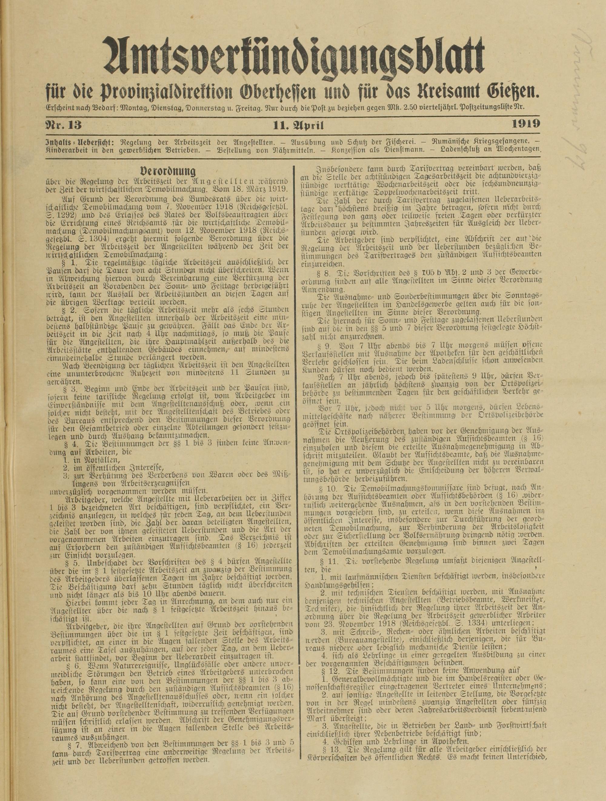 Amtsverkündigungsblatt für die Provinzialdirektion Oberhessen und der Kreisämter Gießen, Friedberg, Büdingen, Lauterbach, Schotten und Alsfeld. 1919-1937