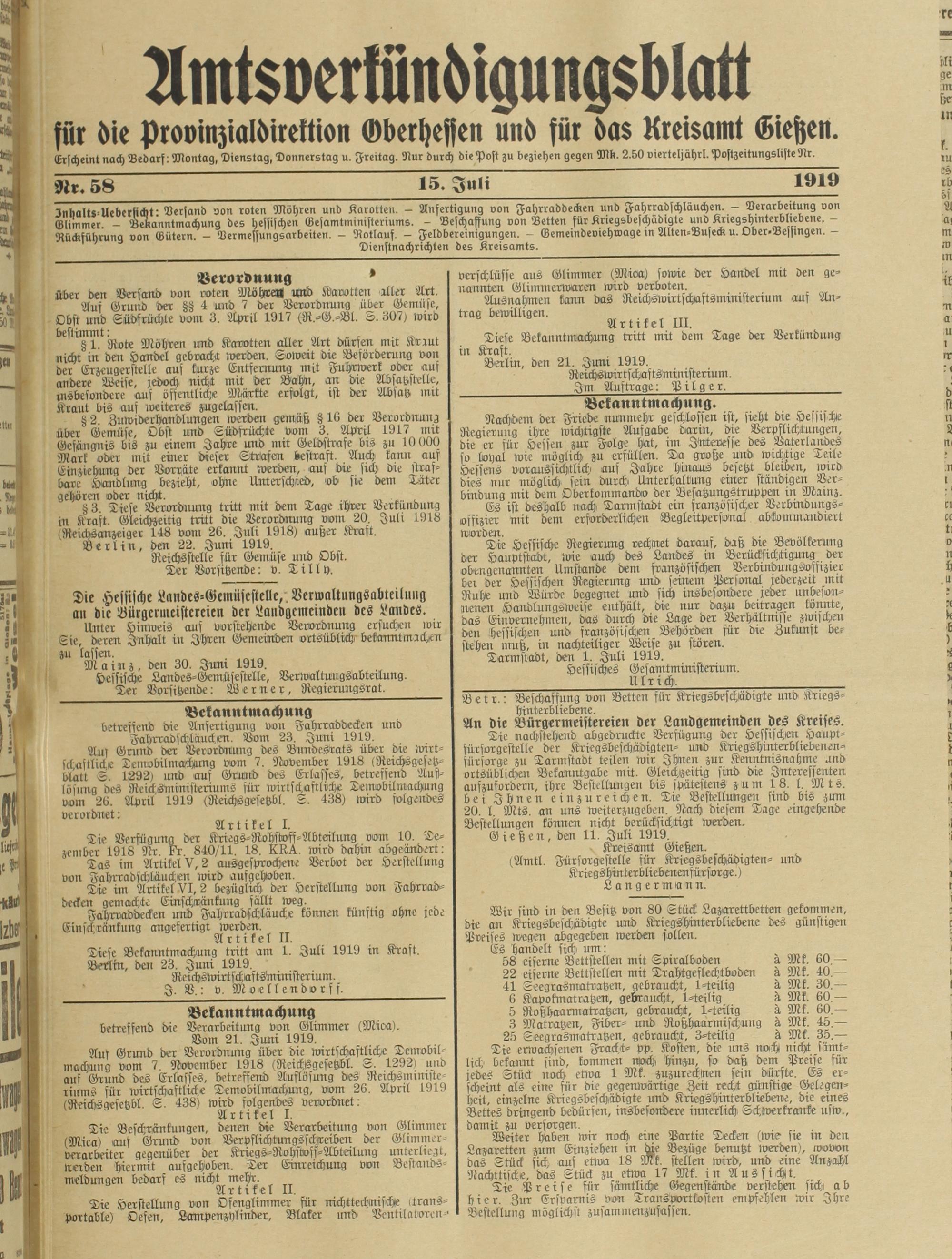 Amtsverkündigungsblatt für die Provinzialdirektion Oberhessen und der Kreisämter Gießen, Friedberg, Büdingen, Lauterbach, Schotten und Alsfeld. 1919-1937