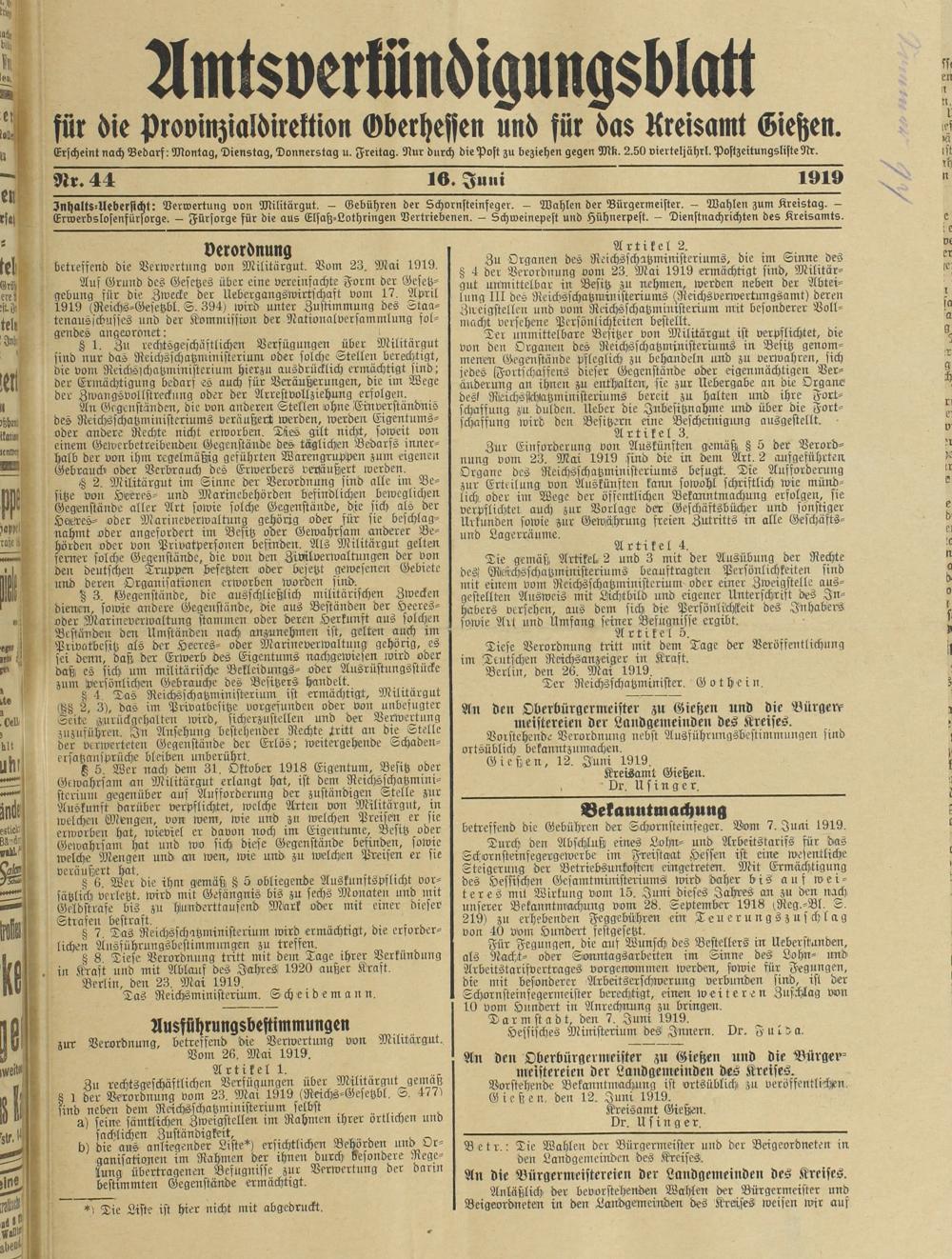 Amtsverkündigungsblatt für die Provinzialdirektion Oberhessen und der Kreisämter Gießen, Friedberg, Büdingen, Lauterbach, Schotten und Alsfeld. 1919-1937